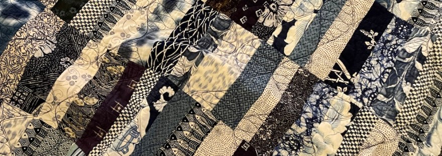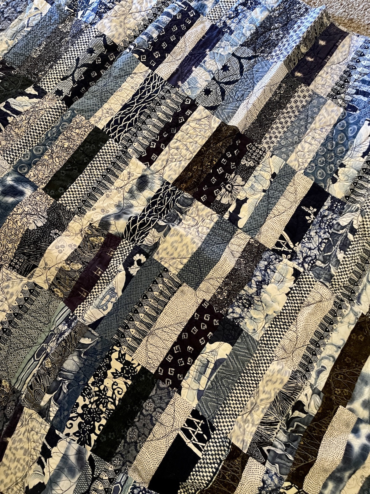 I received a gift from someone’s estate of new and antique Dutch and Japanese blue and white textiles and used those fabrics to create this quilt. After it was quilted and the binding attached, I laundered it to give it more texture.