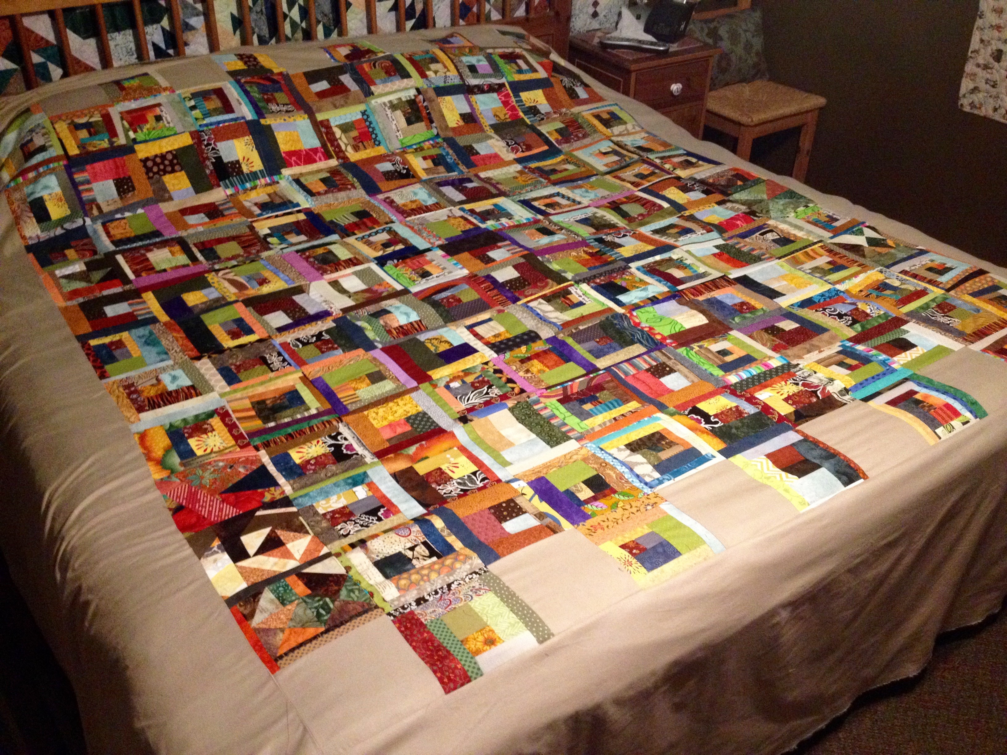 In my 12/6/15 post, What’s on the Design Wall: Backlog, I shared that I discovered 120+ 6.5 inch log jam blocks (scrappy pieced log cabin style blocks) that I had pieced earlier this year. I added in a couple extra blocks recycled from a friend’s discarded blocks and pieced a king size quilt! I will send it off to the long-arm quilter once I figure out what color to use for the backing. I want to do a solid color back, not a pieced back. I am going to buy some 108″ wide backing fabric for it.