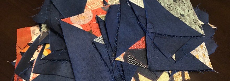 A close up of the denim binding (Terry’s idea) and the pieced :