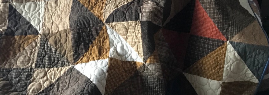 Terry selected the fabric (a fat quarter stack of Woolies flannel), designed the quilt, and pieced the quilt…and assembled the binding then handed it off to his wife to sew onto the quilted quilt!