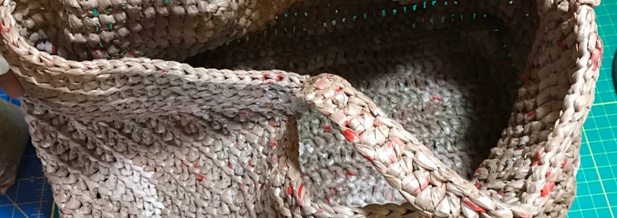 I am repeating the same recycled materials for this year’s art quilt and adding two additional fabrics for the 2017 piece: 1) the fabric from a pair of recycled sweat pants; and 2) a recycled curtain.  Tentatively I am naming it  Recycled Pathway. (I will have to complete the piece and draft up my Artist Statement before I decide on the final title).