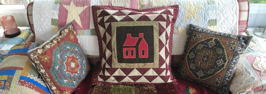 This pillow joins my collection of handmade items on secondhand love-seat in my sunroom that my neighbor gave me. The love-seat is plaid and not really my style, so I covered it with homemade and other second hand items.