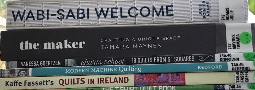 Before I left for my trip to NYC for Quilters Take Manhattan (see my recent posts), a HUGE stack of library books from my library holds all became available at once: