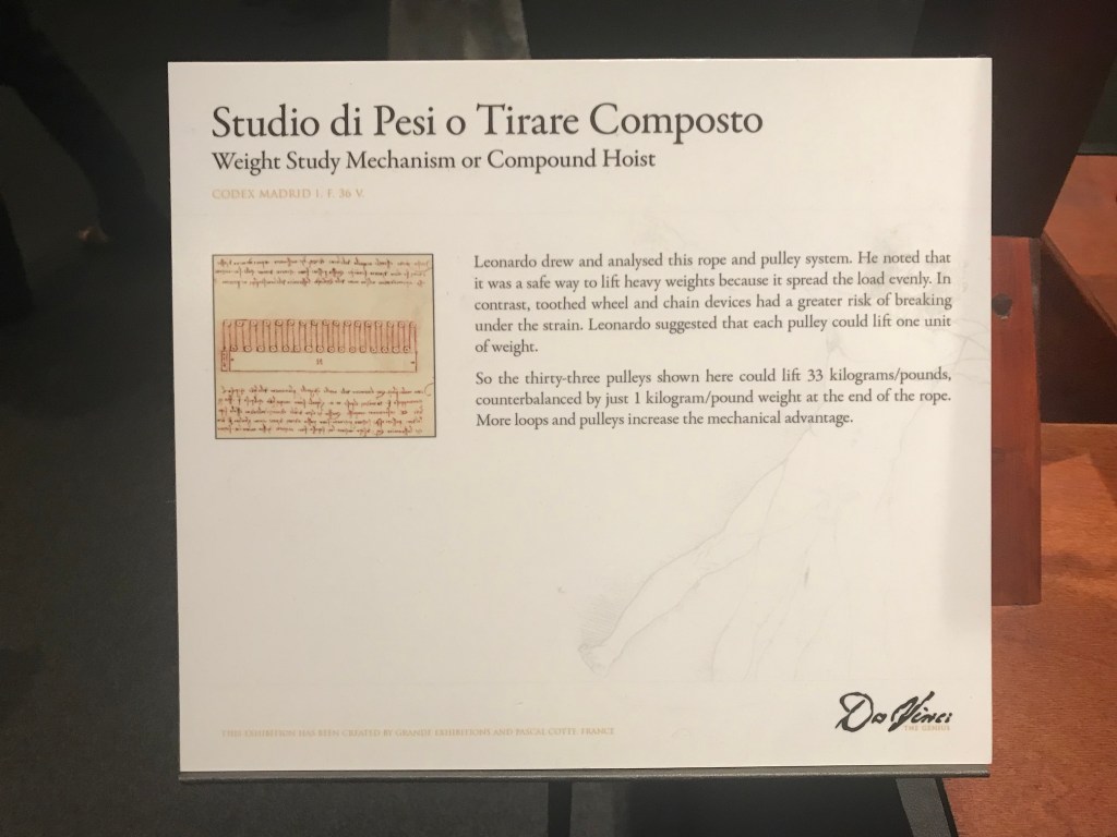 Here are some of the machine models created from da Vinci’s drawings for this exhibit and reproductions of the original drawings.