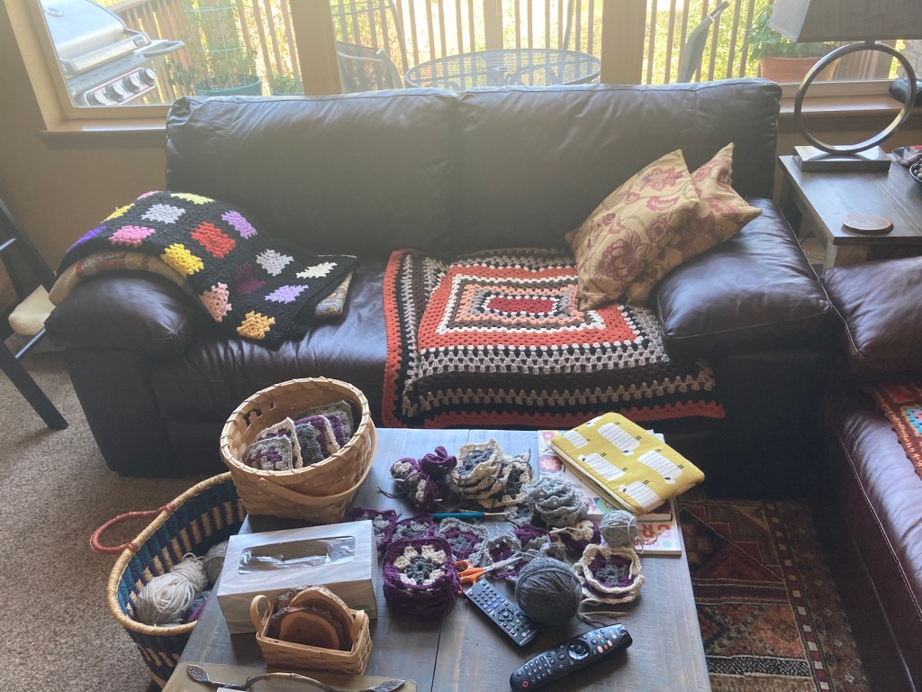 I became a little obsessed with crocheting these blocks and my living room became “Granny Square Central”: