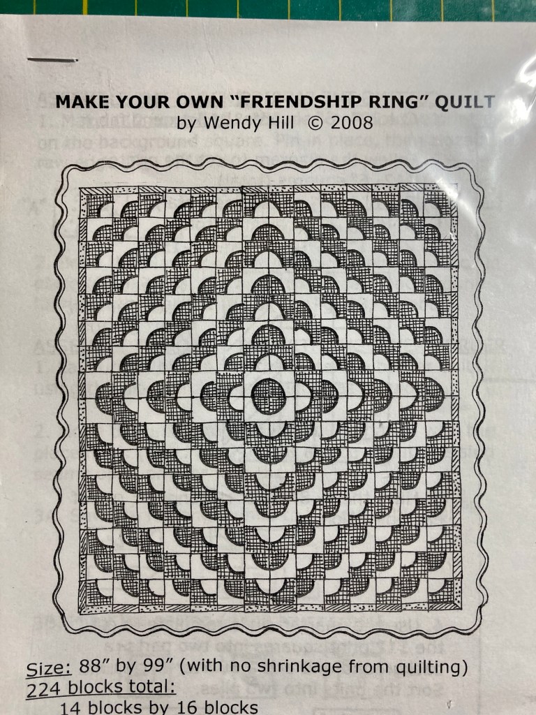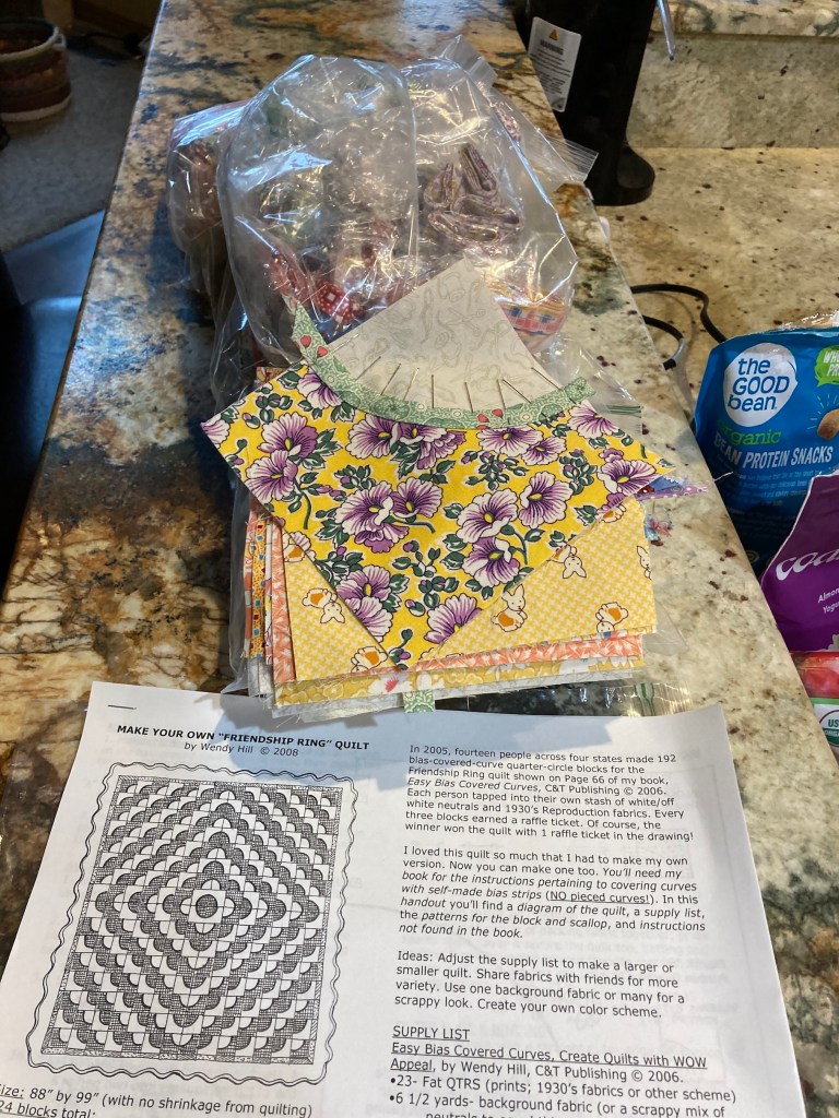 She sent me the pattern she wrote and all the material (pre-cut including bias tape) to make a quilt called Friendship Ringfrom her book Easy Bias-Covered Curves (Wendy Hill, 2006).