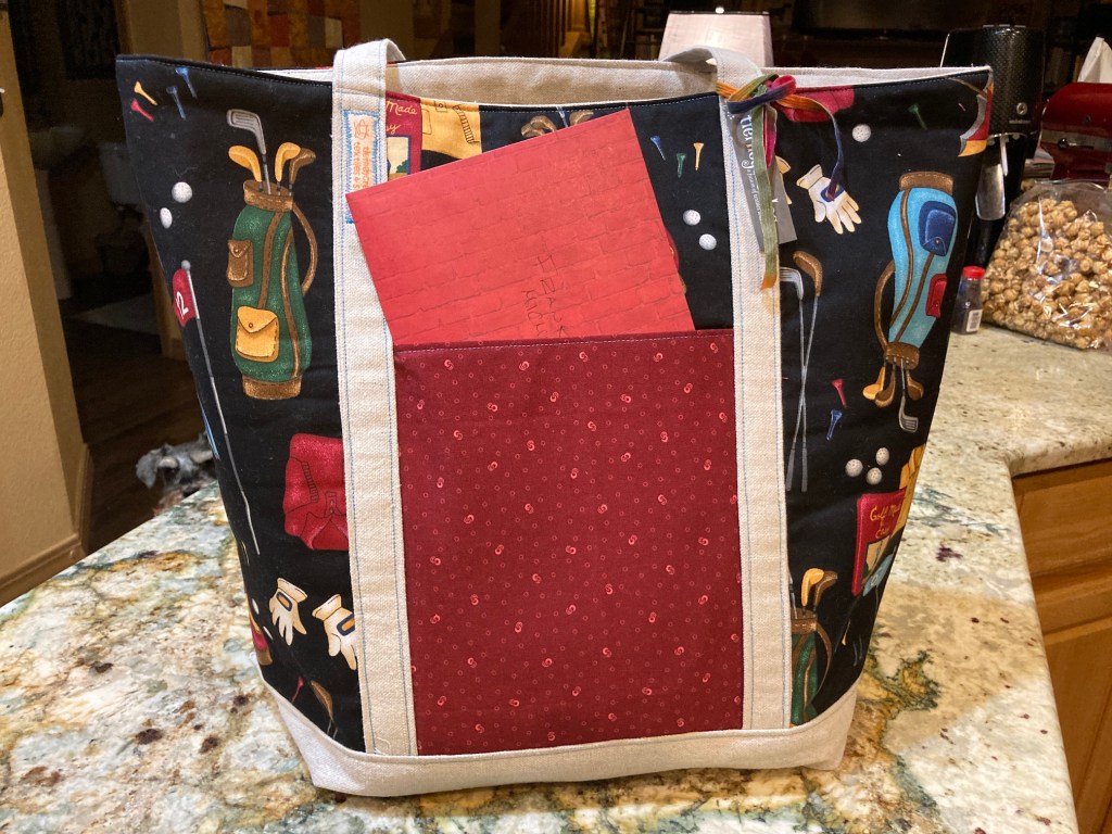 Next came a gift for our friends we golf with (in warmer weather) with some golf themed fabric I found in my stash: