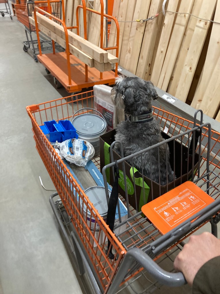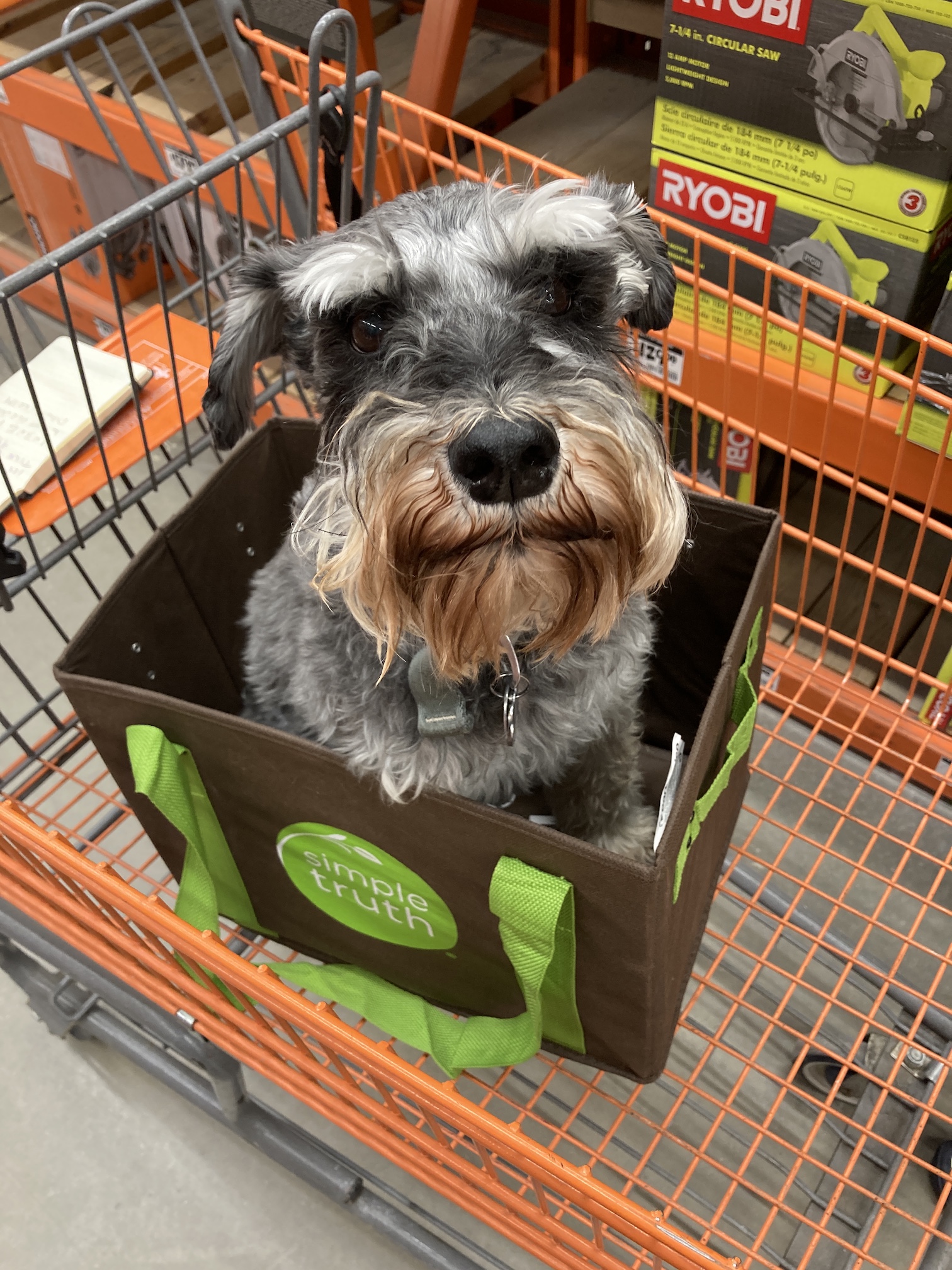 Here is Mike the Miniature Schnauzer riding through another home improvement store to pick up supplies for our next home remodeling project and some canvas drop cloth for more tote bags!