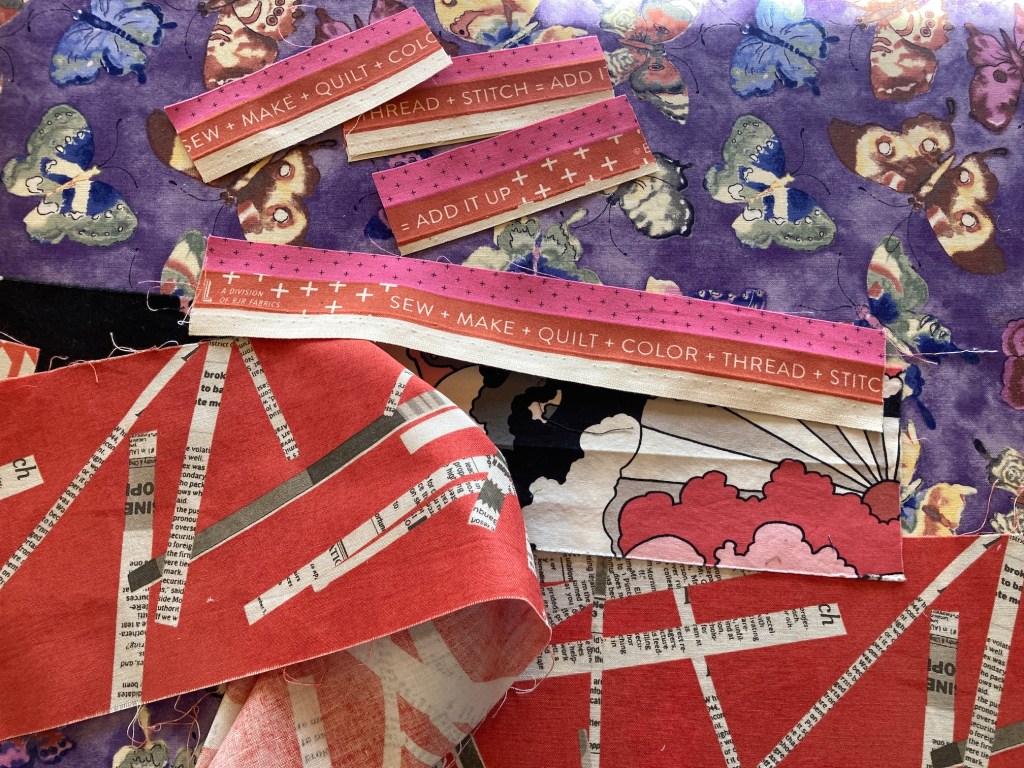 I had fun rifling through my modern prints fabric scraps to find some coordinated scraps as well as some interesting selvage pieces for the sides of the pin cushion: