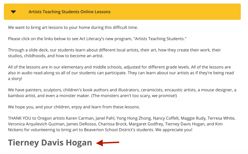 If you scroll down, past the smiling children image to the Artist Teaching Students Online Lessons and click on the arrow next to the text, it will open access to the artists’ lessons