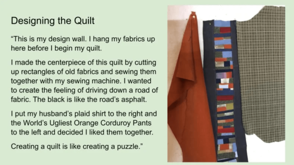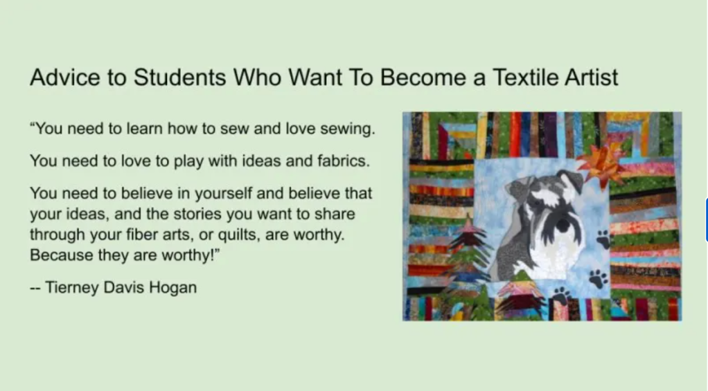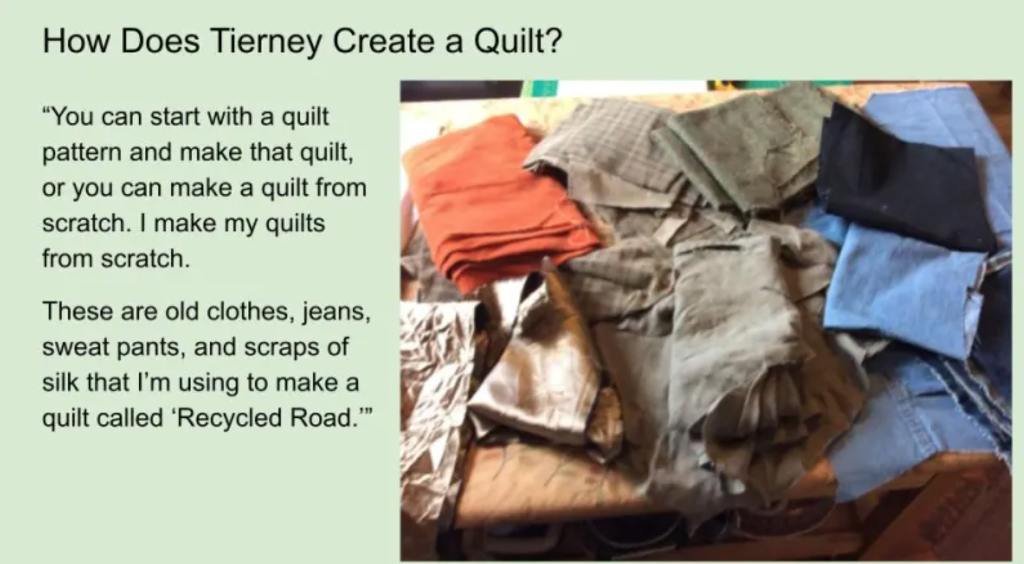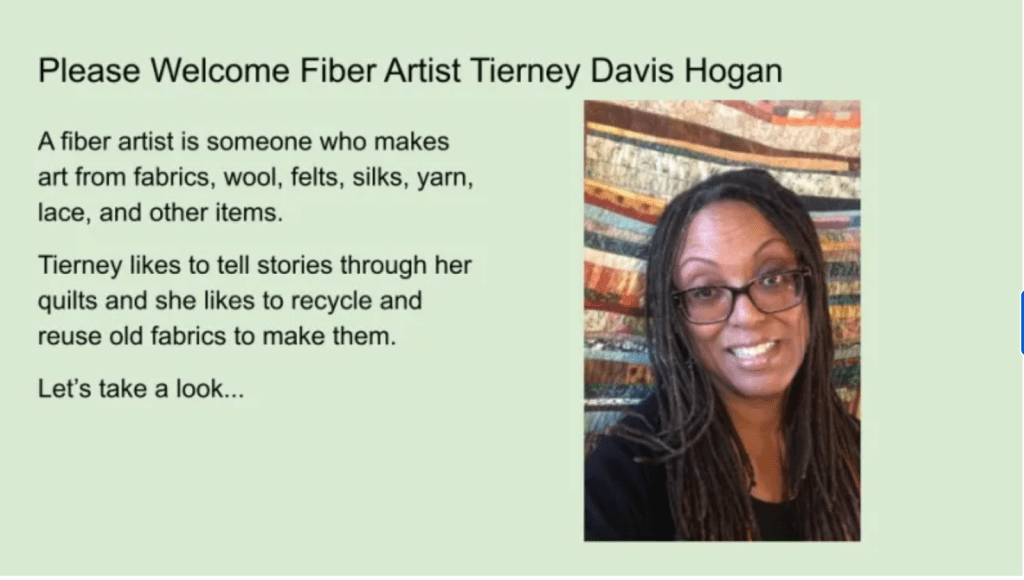 I so enjoyed my collaboration with Cathy and how she helped me tailor concepts, such as my overall Artist Statement on my Artist Statement page on tierneycreates.com, and the artist statements for the quilts in the slide deck, into words and concepts that would be meaningful to kids. She had me just talk about how I felt about developing different quilts in plain language and she translated that into text for elementary and middle school students. It was a memorable and poignant conversation.