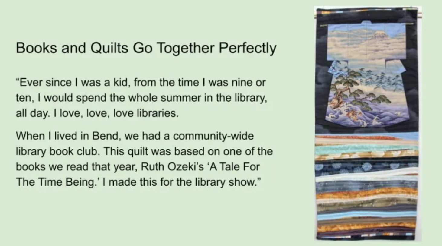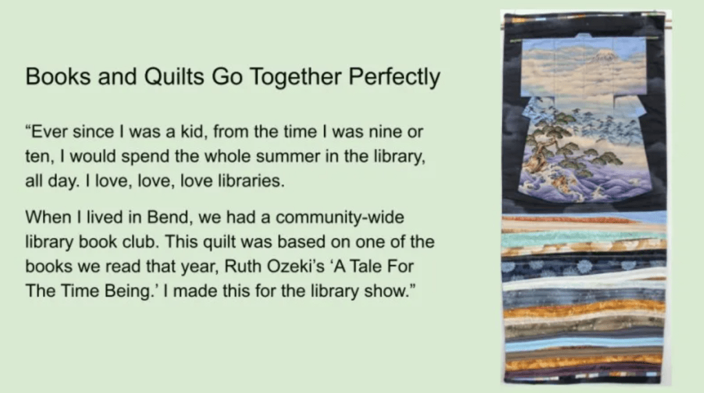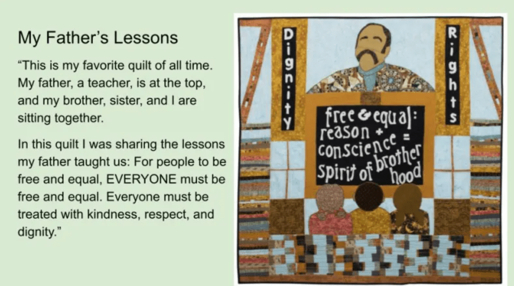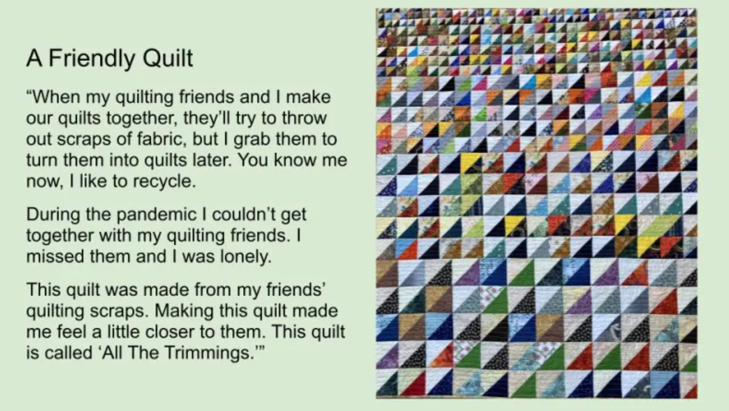 I so enjoyed my collaboration with Cathy and how she helped me tailor concepts, such as my overall Artist Statement on my Artist Statement page on tierneycreates.com, and the artist statements for the quilts in the slide deck, into words and concepts that would be meaningful to kids. She had me just talk about how I felt about developing different quilts in plain language and she translated that into text for elementary and middle school students. It was a memorable and poignant conversation.