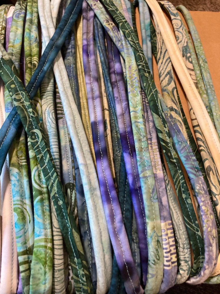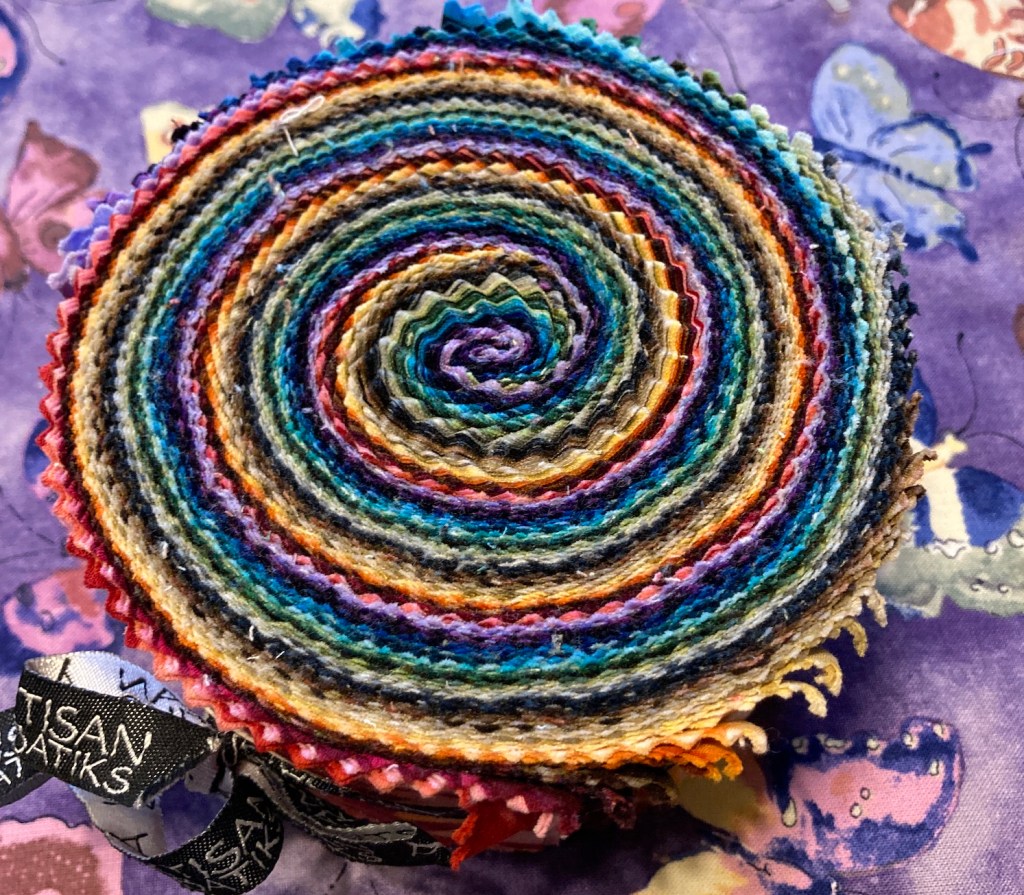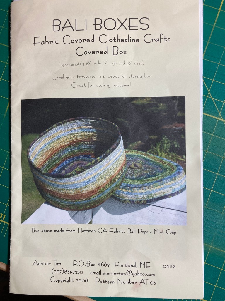One of the projects he worked on prior to his passing in December 2018 was covering clothesline with batik jelly roll strips (40 – 2.5″ x 42″ strips) to make Bali Boxes (actually “bowls” as I do not make the boxes) from the pattern by Aunties Two: