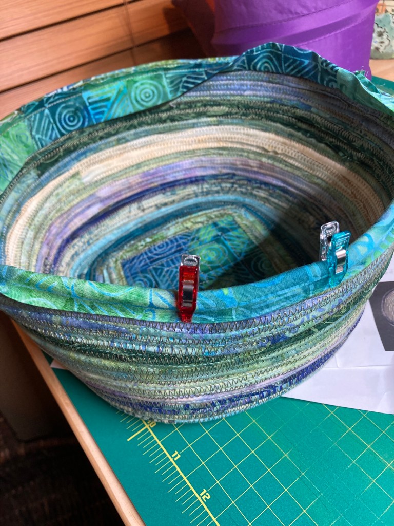 Here is the basket for Terry’s sisters fresh off the sewing machine and then an image of the binding for the top being put on:
