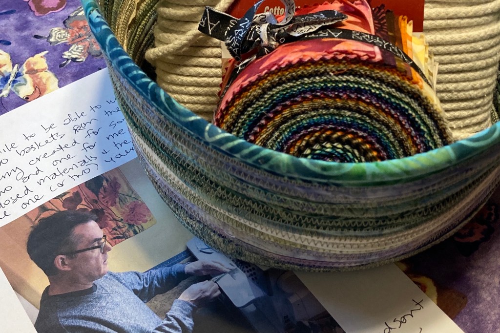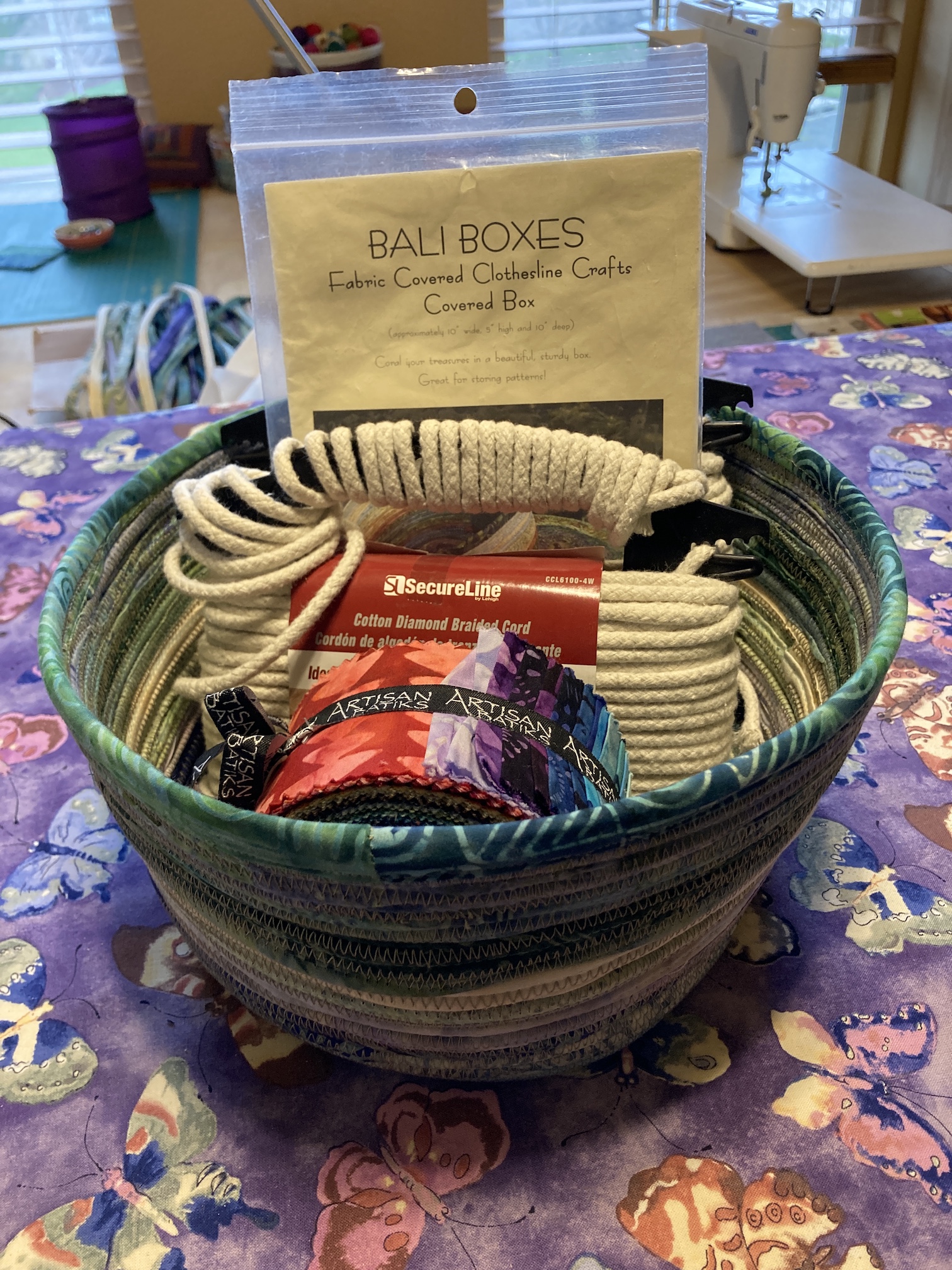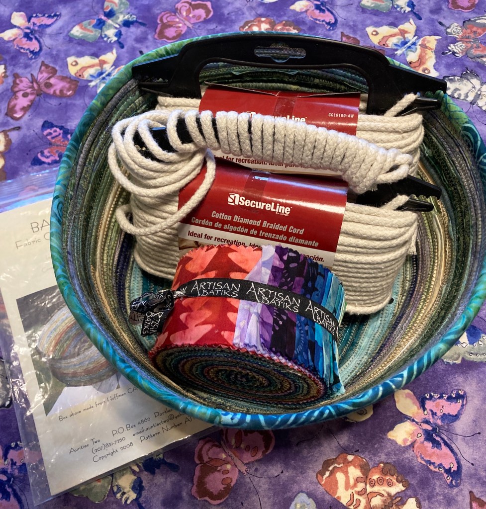 You might wonder what is peeking out of the top of the completed basket. Well I decided that my era of making baskets was done for now and I put together a kit for Terry’s sisters to make their own baskets to include: 1) a batik jelly roll; 2) the pattern; and 3) several packages of clothesline rope: