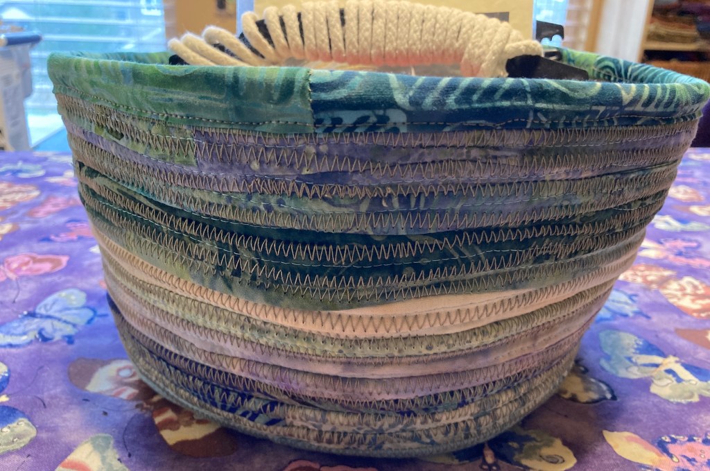 So continuing my journey to complete anything he started before he passed, I realized it was time to make something with the clothesline he covered in batik strips. I decided to make two baskets: one for his sisters Diane and Susan, and one for me.