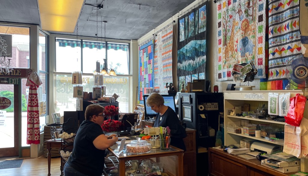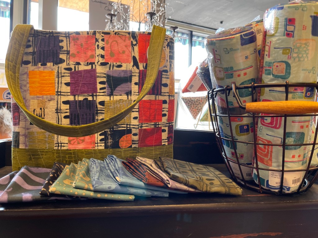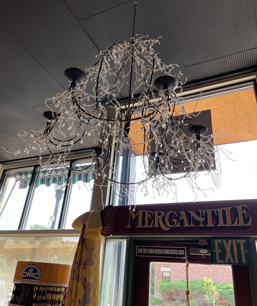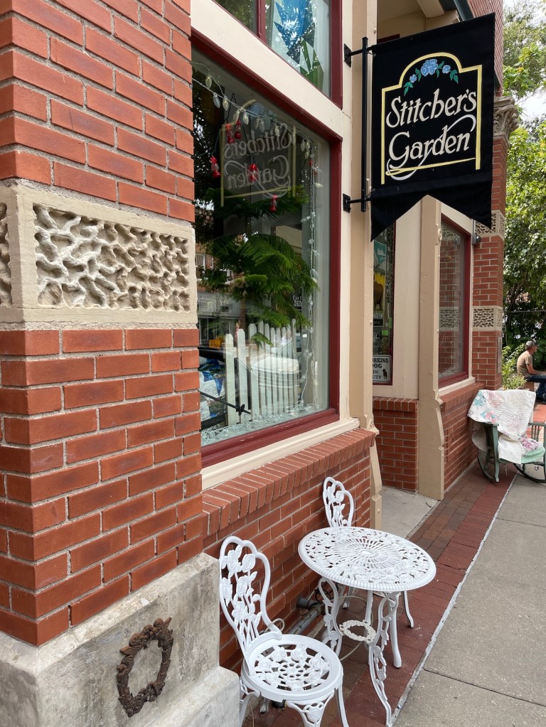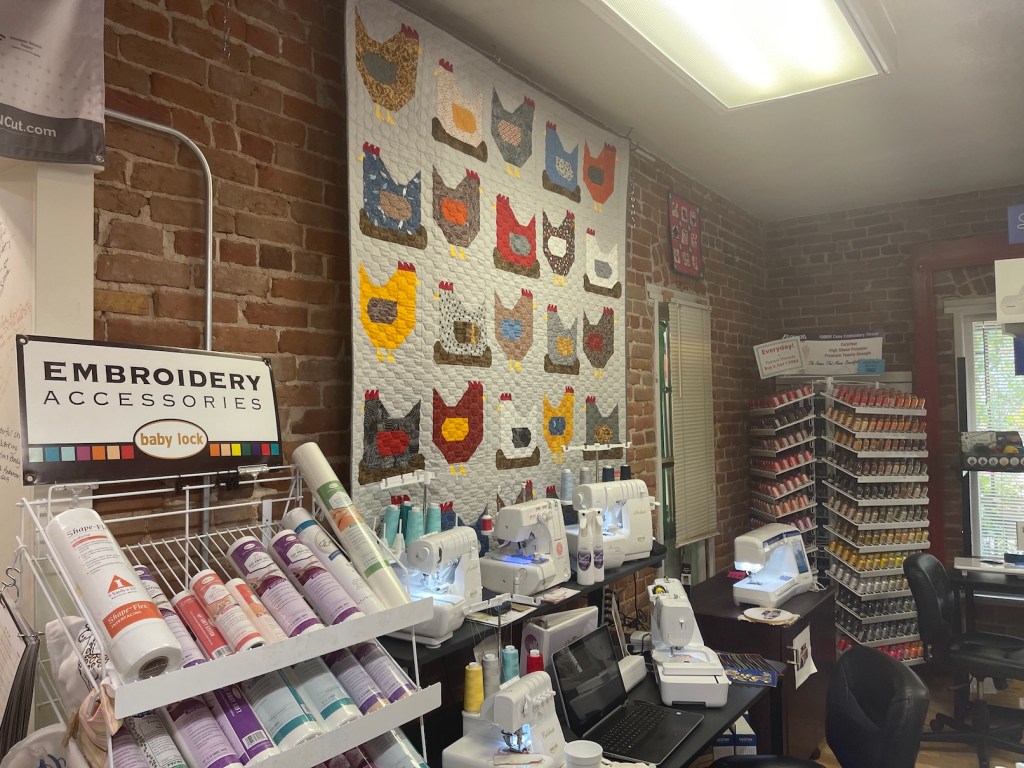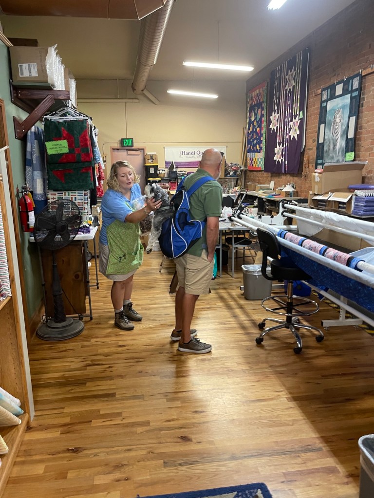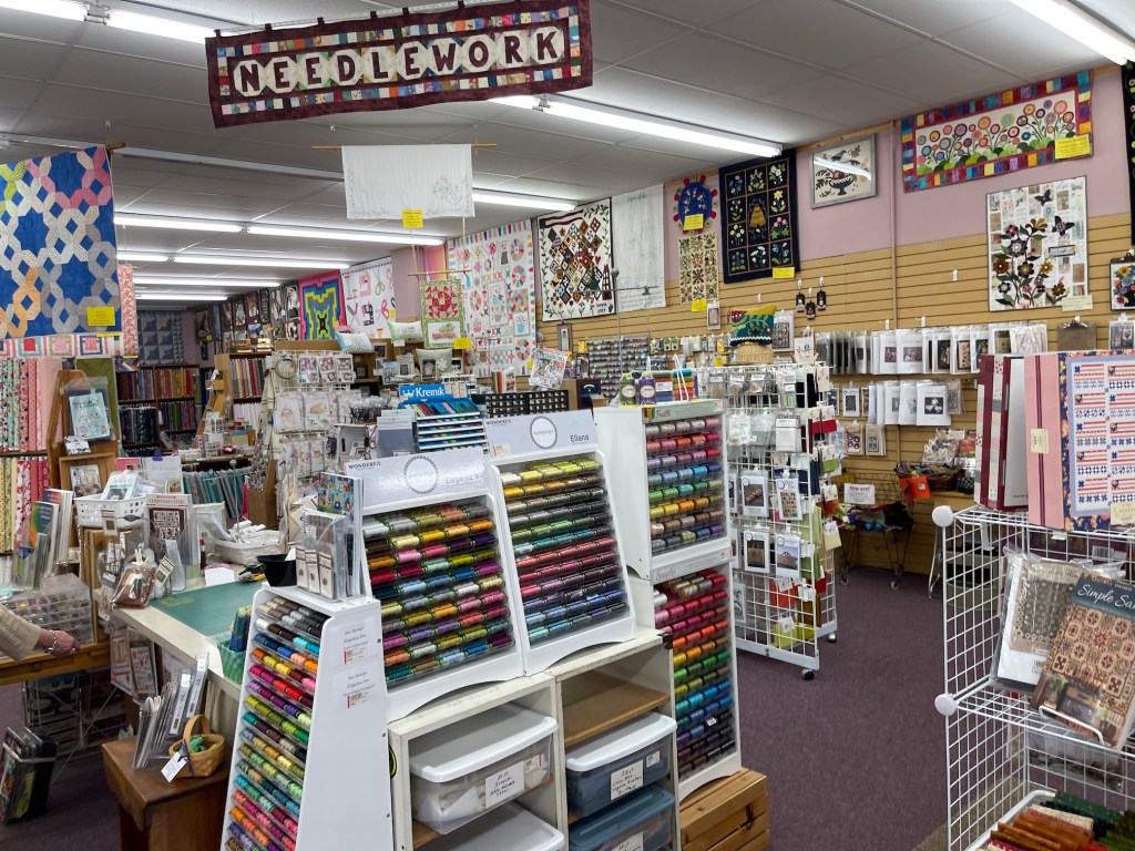 So while my woodworking partner John, with Mike the Miniature Schnauzer in a backpack on his back, wandered about Woodcraft, I wandered inside Ruth’s Stitchery.