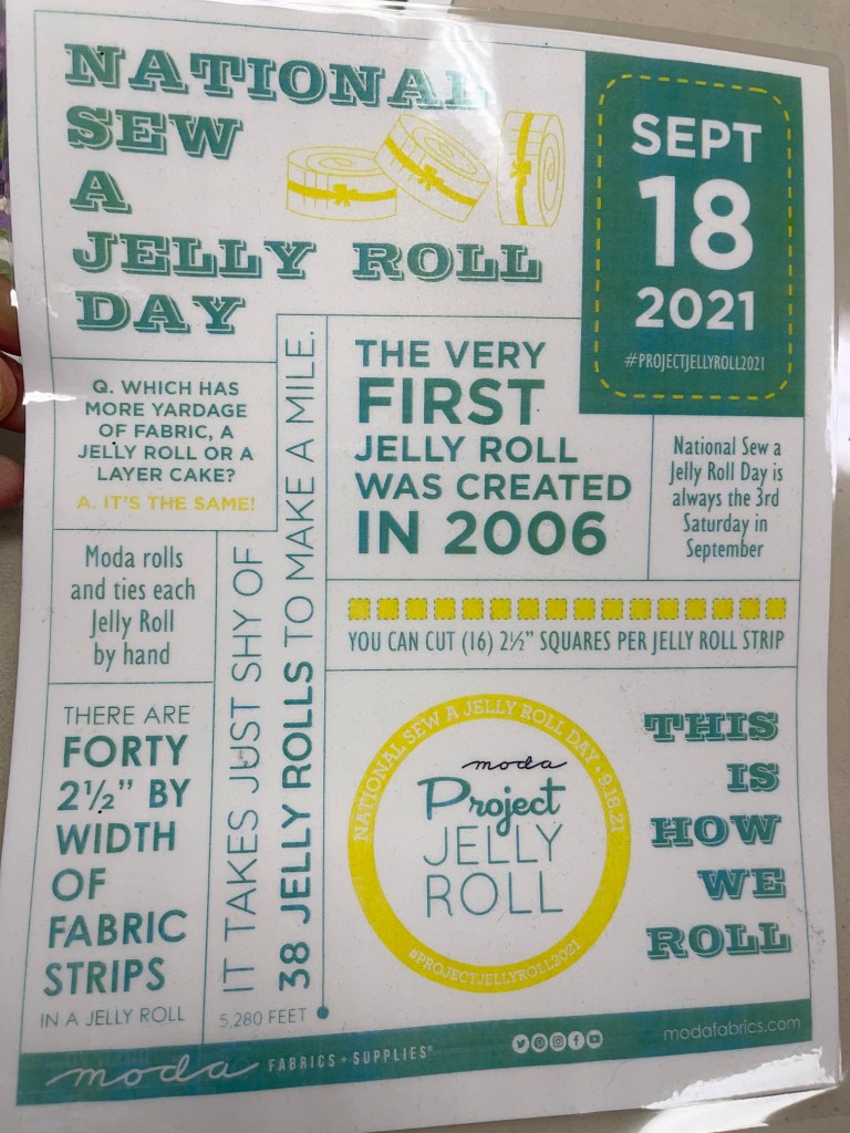 During one of our visits to this quilt shop (oops I just gave our secret away) I discovered that there is actually a National Sew A Jelly Roll Day on Sept 18, 2021. So quilters get your jelly rolls ready to participate – ha!
