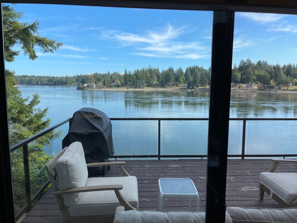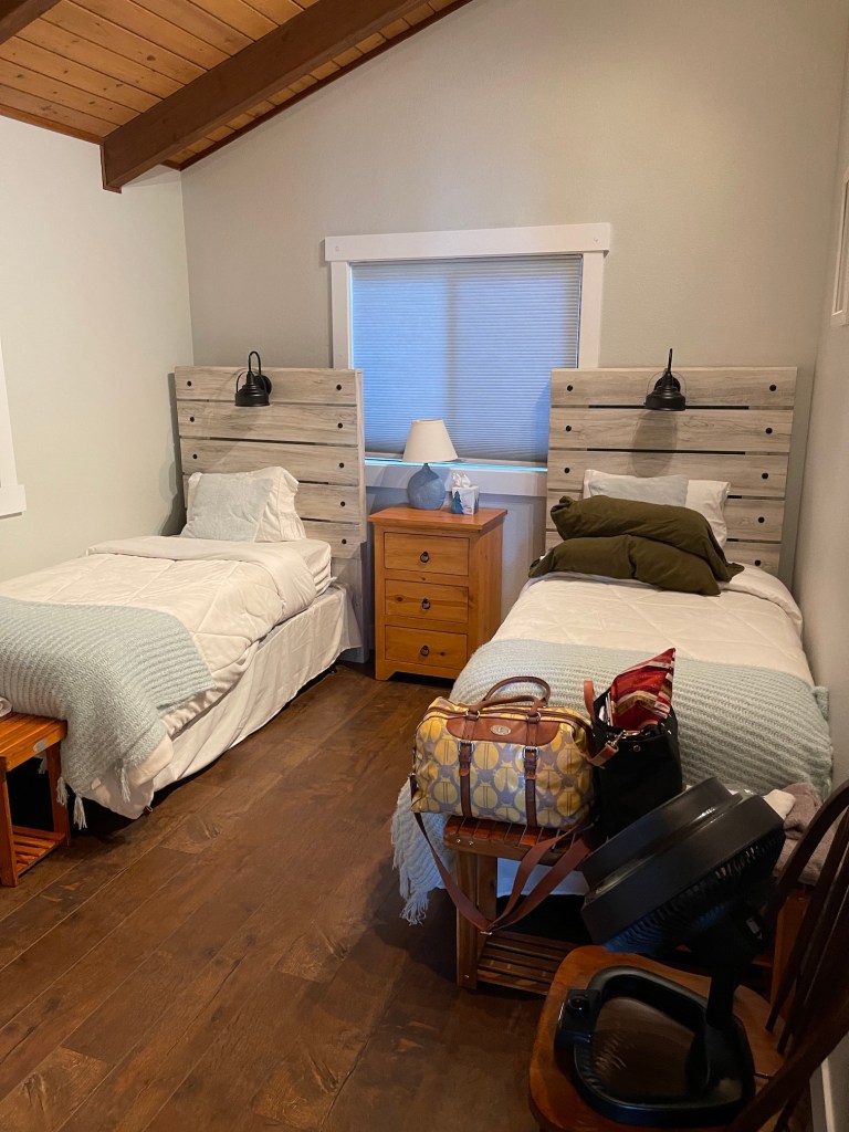 In addition to the upstairs and its deck overlooking the water, the retreat center also had a downstairs with a cozy seating area, additional beds, and access to the downstairs deck.