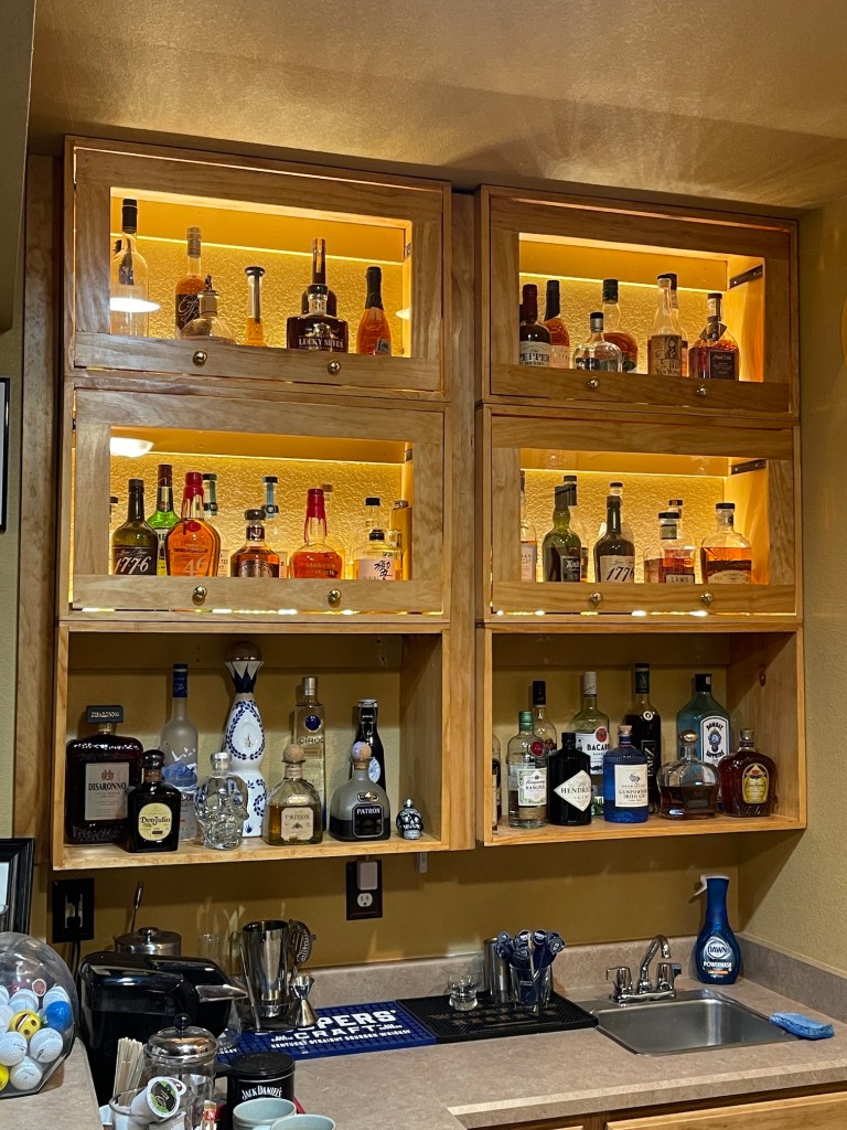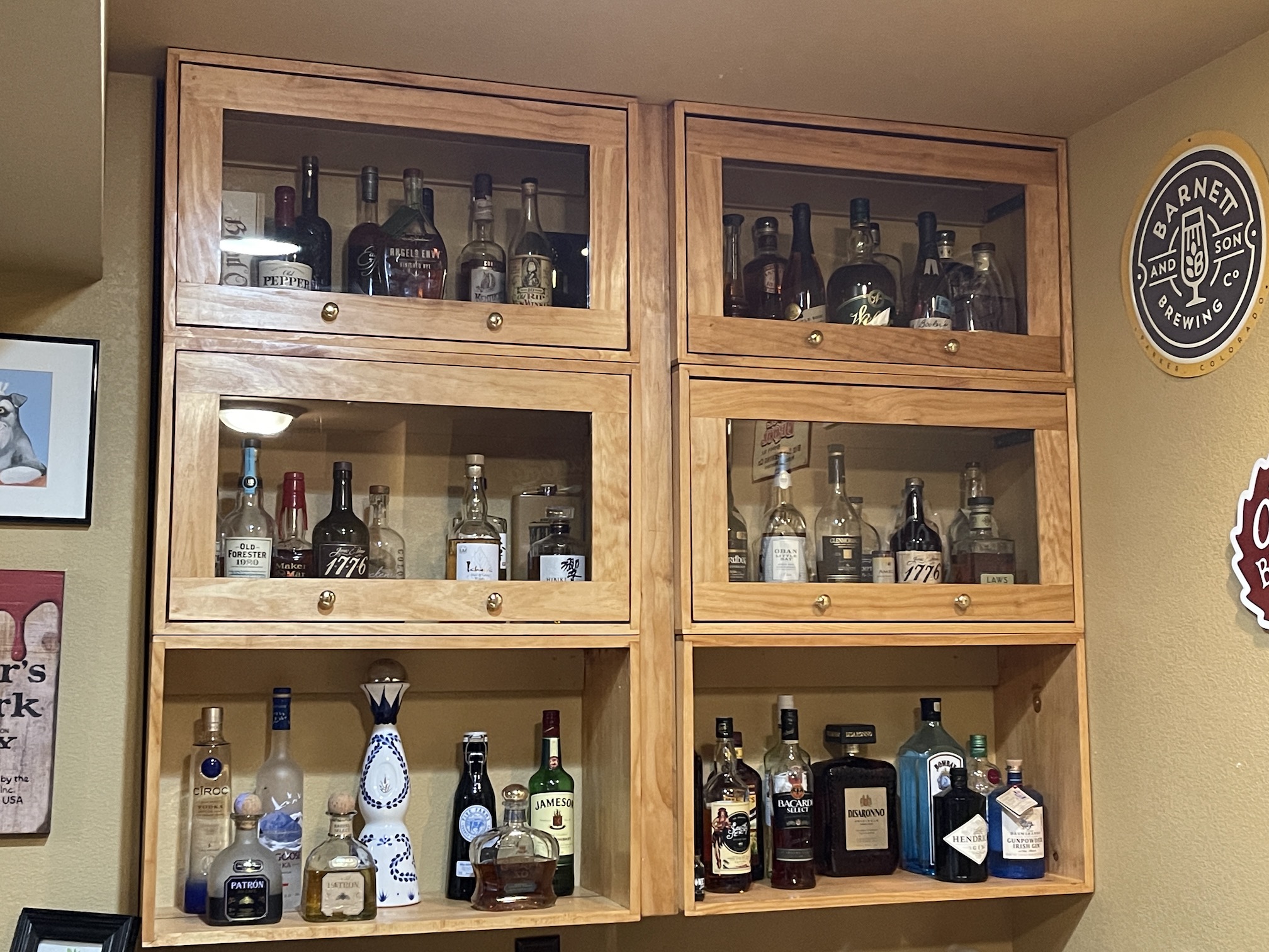 And here are the completed bookcases mounted as his new liquor cabinet in our bar: