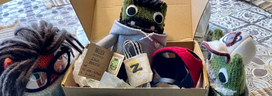 In my previous post I shared our excitement to add FAITH BEASTIE, human John’s granddaughter’s new Beastie (see post Guest Blogger: New Member in Our Beastie Family). Well for his birthday, human John got his son Zach his own ZACH BEASTIE!