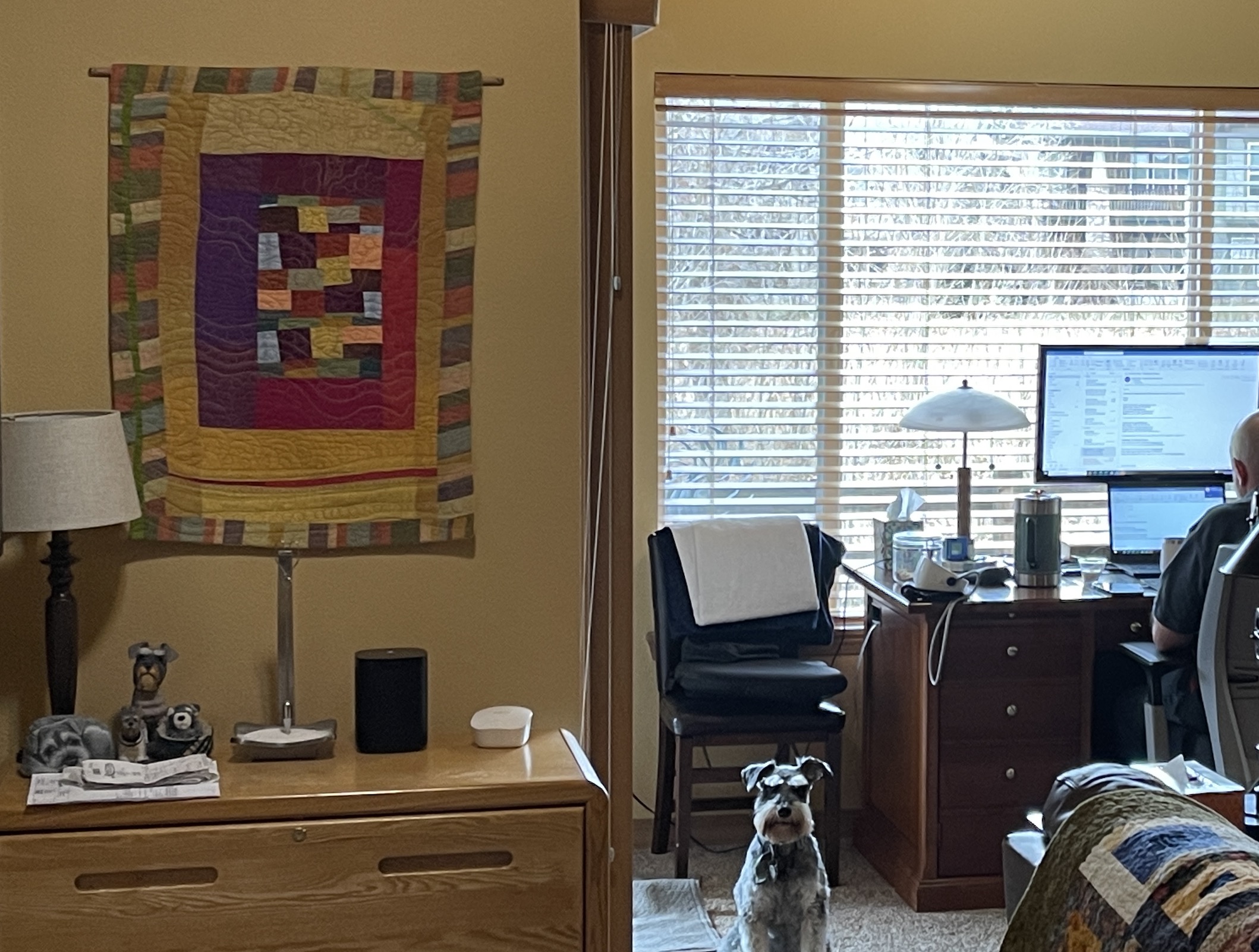 John’s home office and his coworker Mike the Miniature Schnauzer always ready to consult