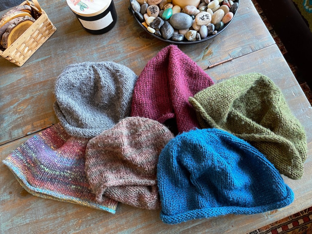 They all look sort of “tired” compared to the colors in that yarn. Oh and speaking of “tired”, I keep using the same pattern over and over again because it is easy and comforting to knit.