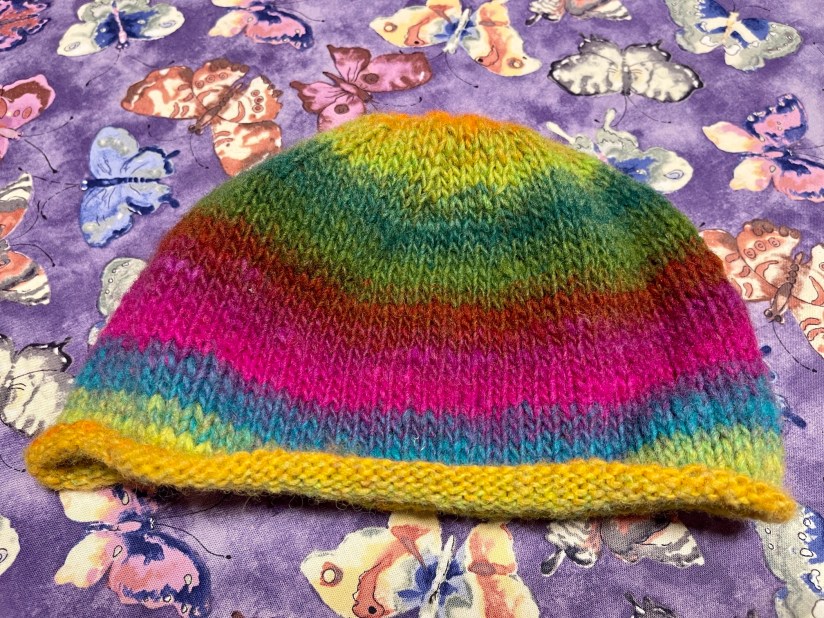 How the knitted hat I made from yarn I discovered in my stash turned out too small (follow up to blog post Hot Mess of Yummy Yarn); and
