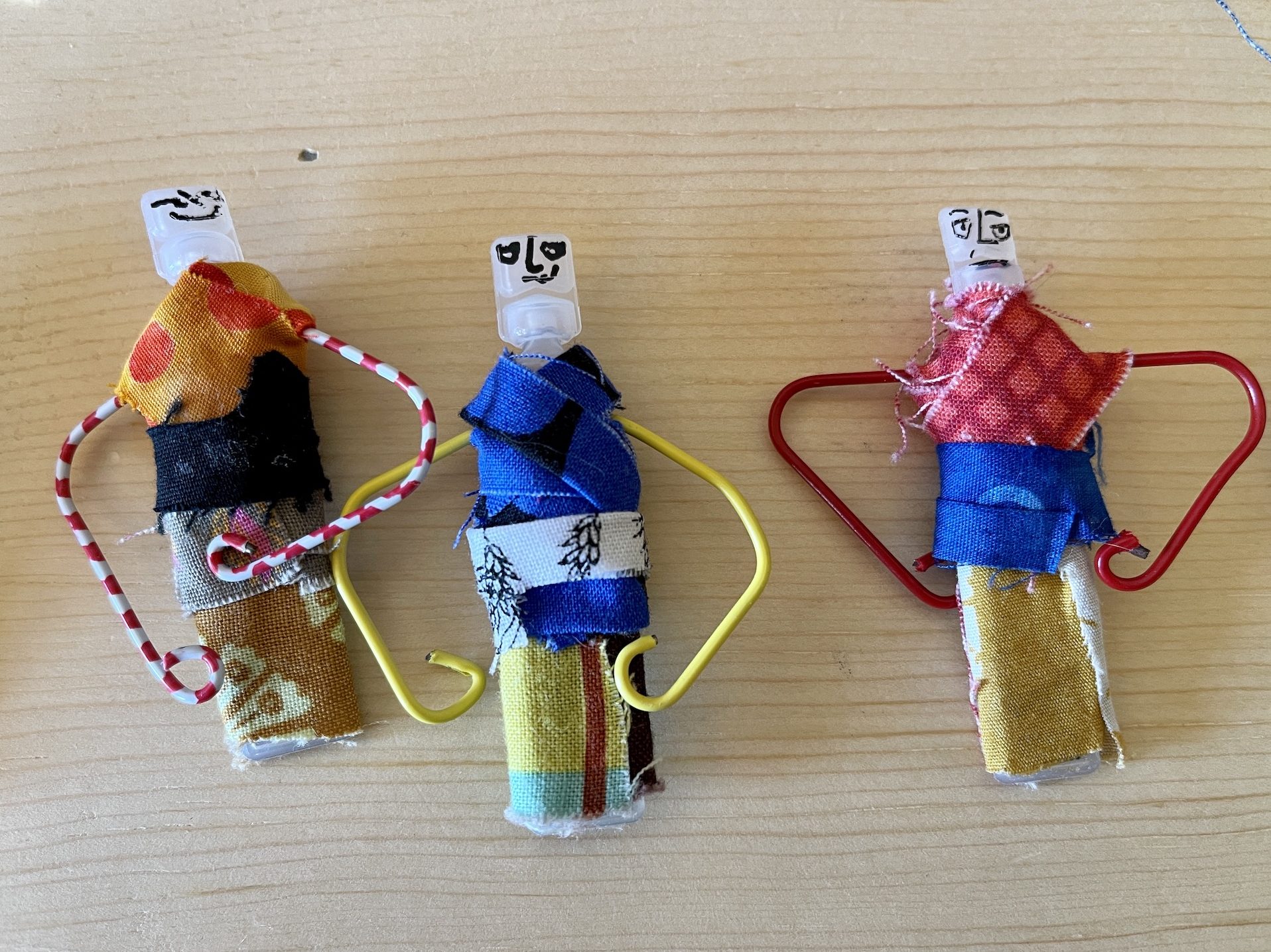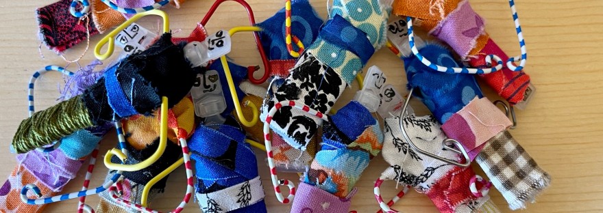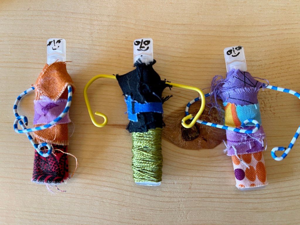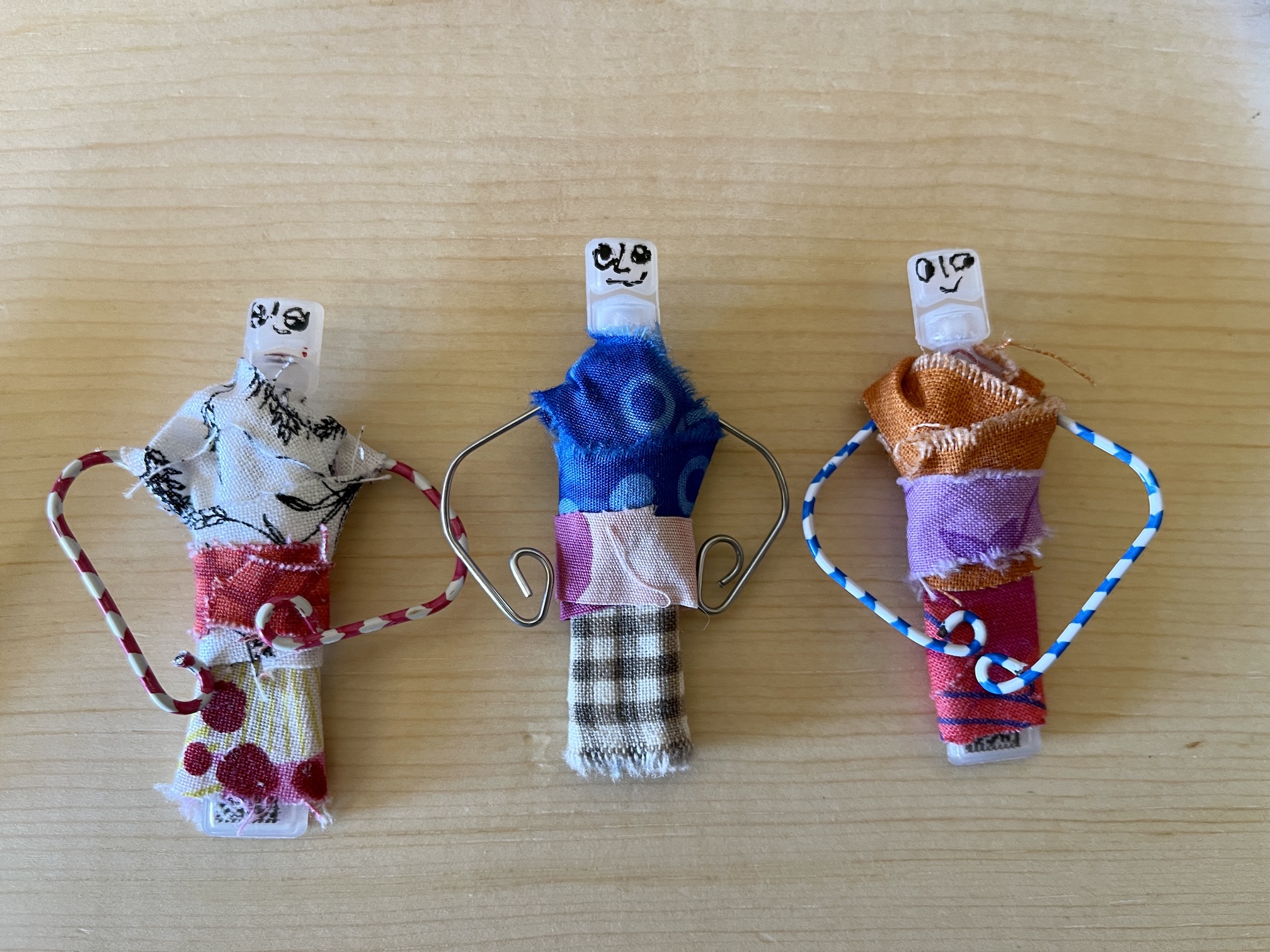 Around the same time I was in the process of cleaning up my fabric scrap collection and pulling out the tiny pieces I was likely never to use. I started to discard the scraps into the trash bin (gasp) but then I realized they were the right size for Claudia’s eye medicine vial people (or other art projects she does with small fabric scraps).