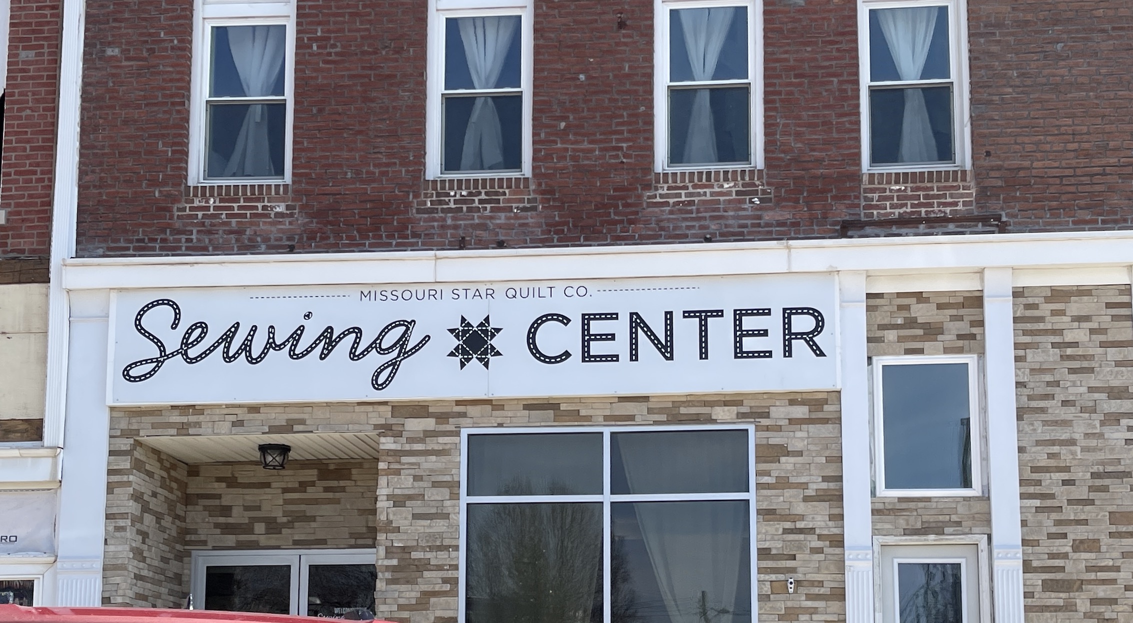 My long time quilting friends and I have ordered from the MSQC website over the years and have been familiar with their story for about six years. So it was pretty exciting when we arrived in town on the shuttle van we took from the Kansas City airport. Here is what we first saw from the shuttle van and then immediately walking around when we arrived in Hamilton, MO: