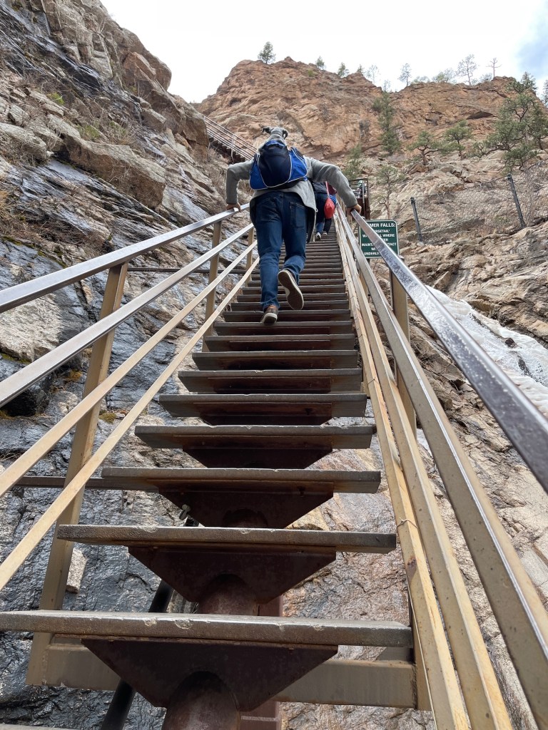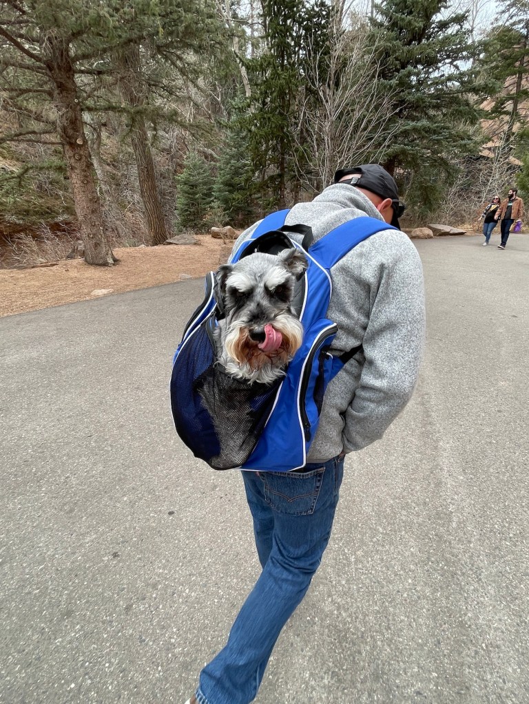 I am not sure if my Humans Tierney and her partner John will like this post, because I am going to tell you of how they attempted to COMPLETELY TERRIFY me by taking me on a day trip to Seven Falls in Colorado Springs, Colorado and making a death-defying vertical climb up the scariest stairs I’ve ever seen, with me in a backpack!