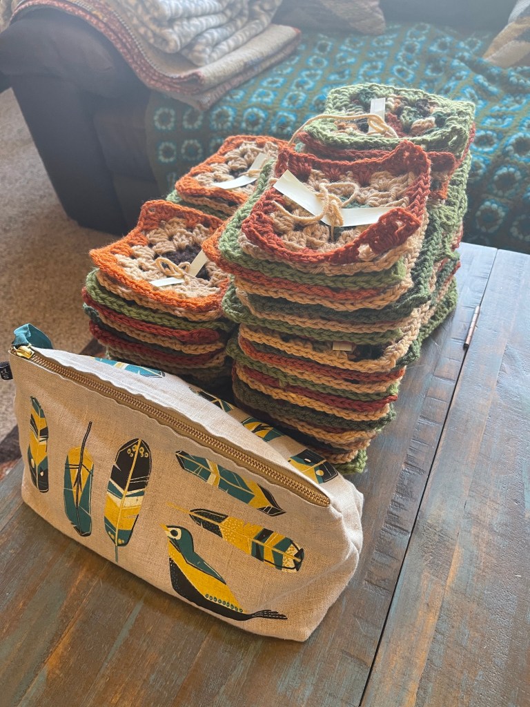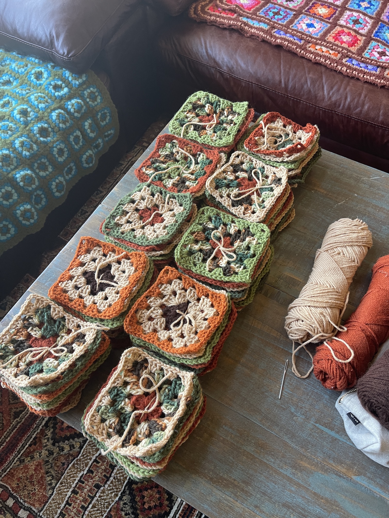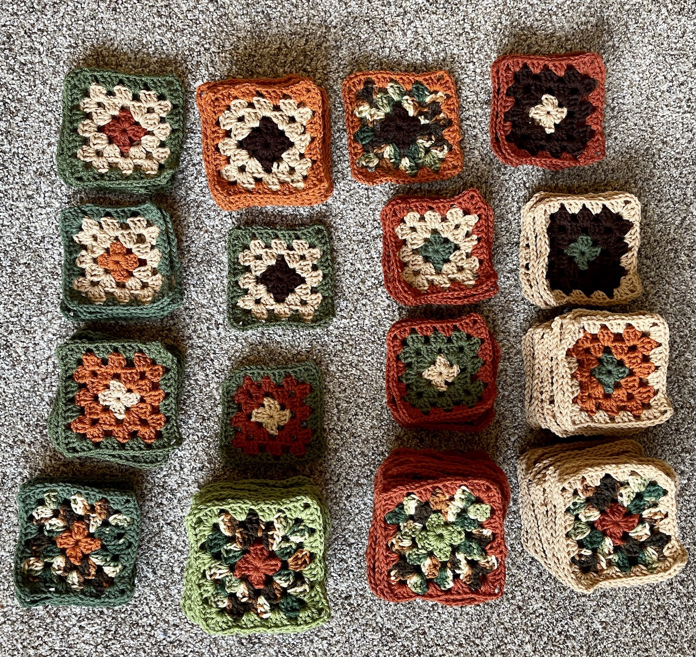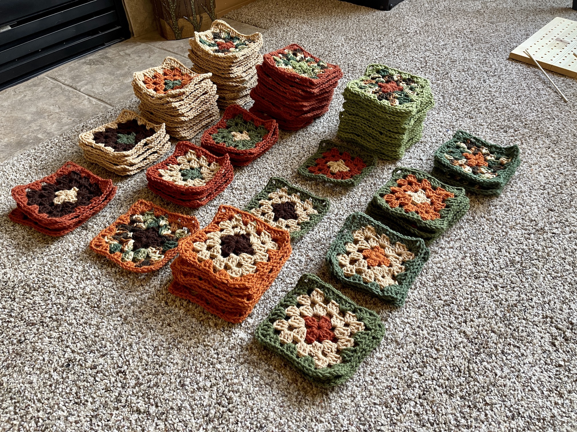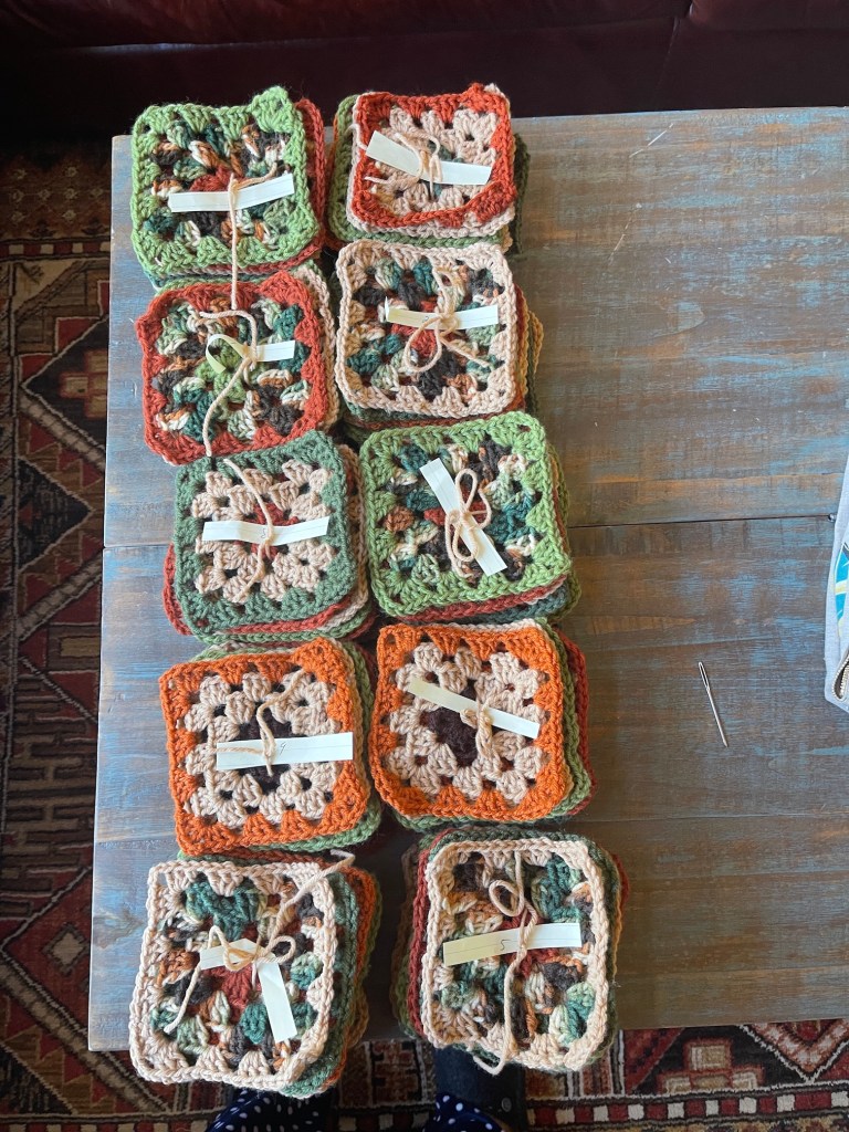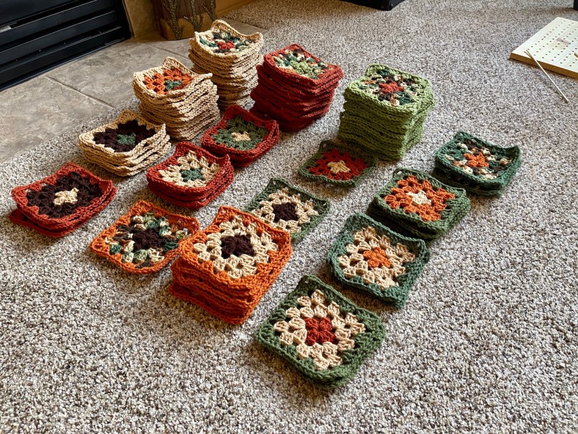 I’ve completed crocheting a 100 granny square blocks! Here they are in piles based on yarn combinations: