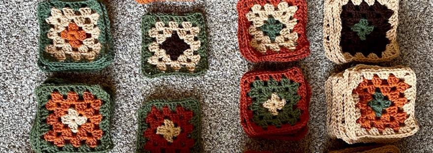 I am going to join the granny squares with brown yarn to make a lattice between the squares and then finish off the blanket with a green border, and perhaps a rust border too. We’ll see how it evolves, but first I have to put on a YouTube video on how to join the granny square blocks again (I forgot what I did on my first granny square blanket – Attack of the Giant Granny Square Blanket).