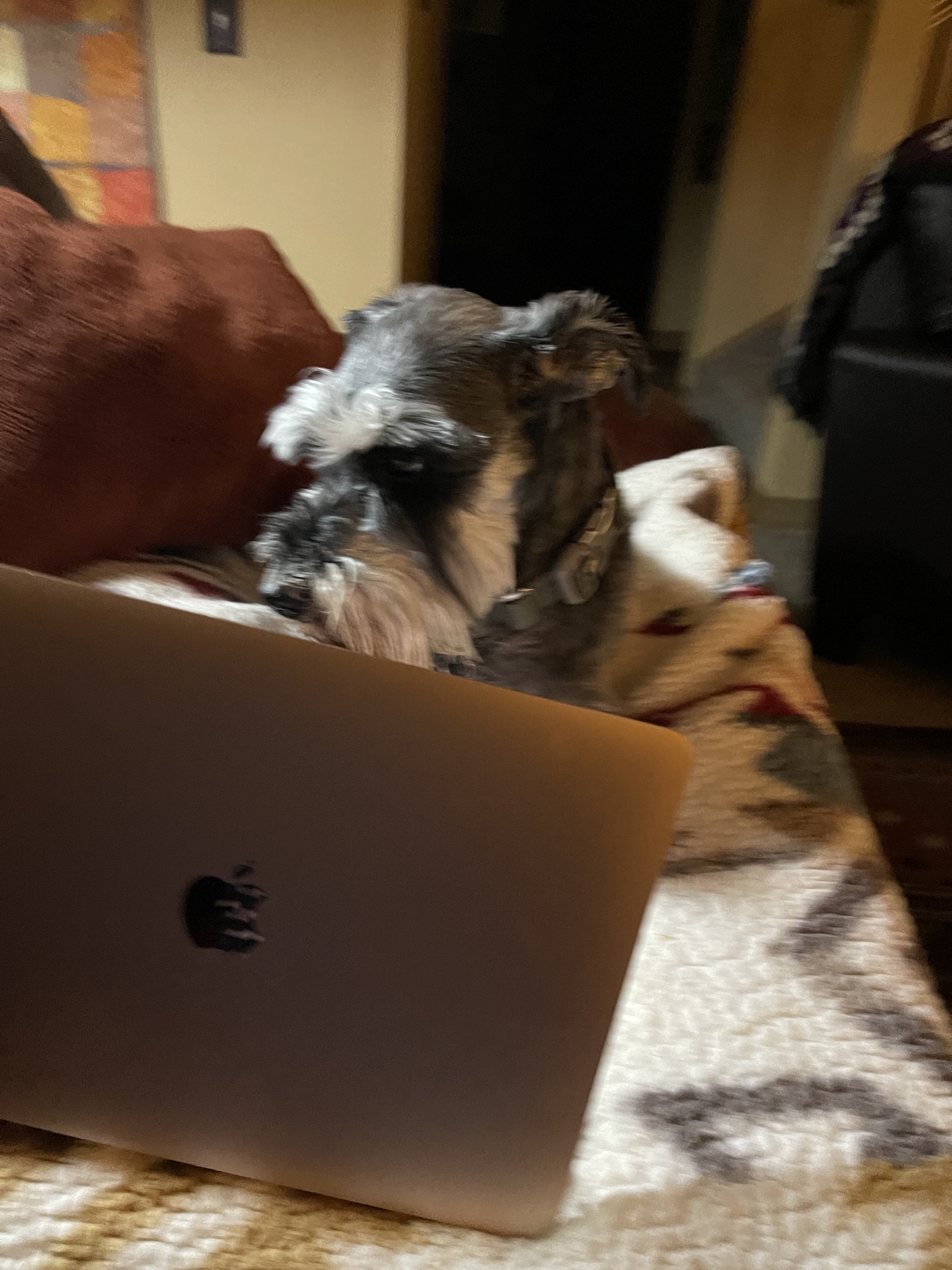 Mike the Miniature Schnauzer tried to distract me while I was sorting and laying out the squares, with his cuteness:
