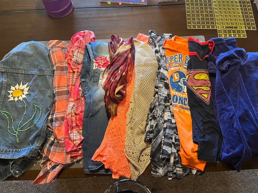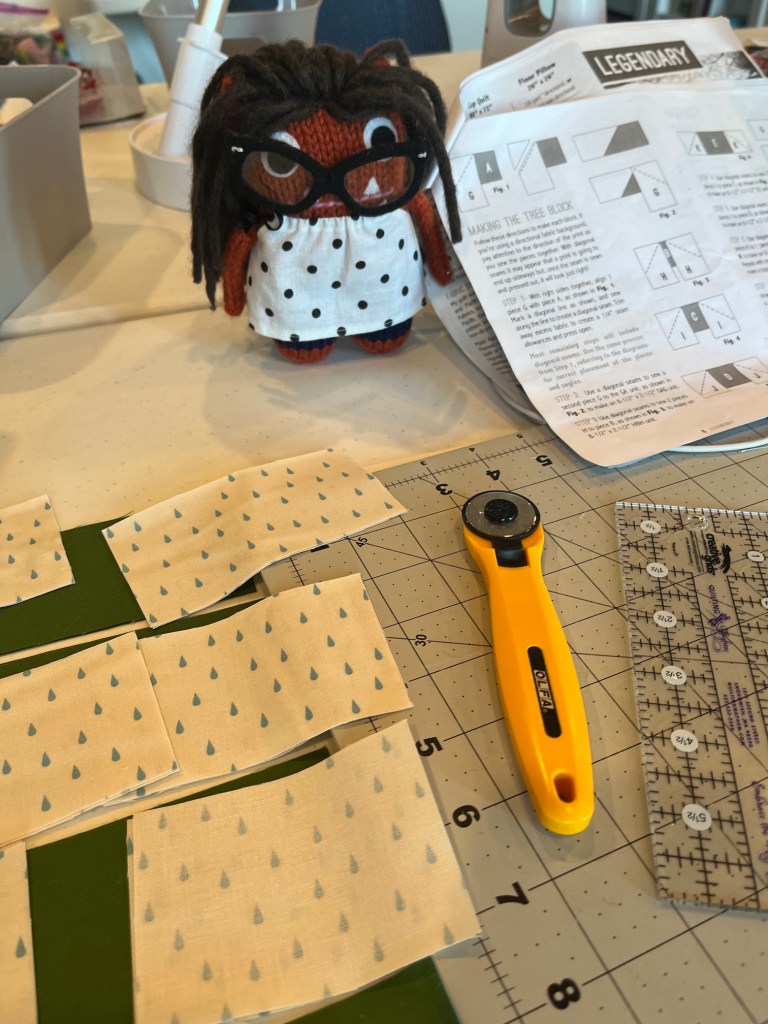 Dana has made the quilt several times in flannel and is now making the quilt in quilting cotton for a charity raffle. This is the same quilt in progress you saw pieces of in my photo from a previous post in this series, where I am trying to gain access to Dana’s rotary cutter (unsuccessfully):