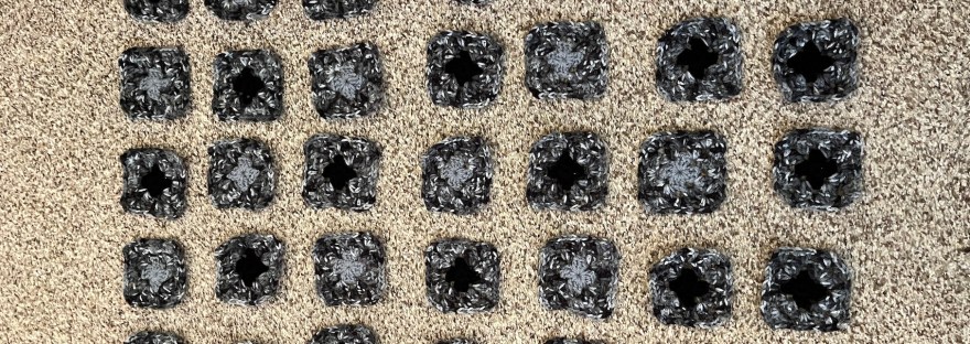 Oh and speaking of granny squares, here is little follow up on my post What’s On the “Design Carpet”, about the gray and black granny squares I’ve been making while riding in the car, for a future blanket.