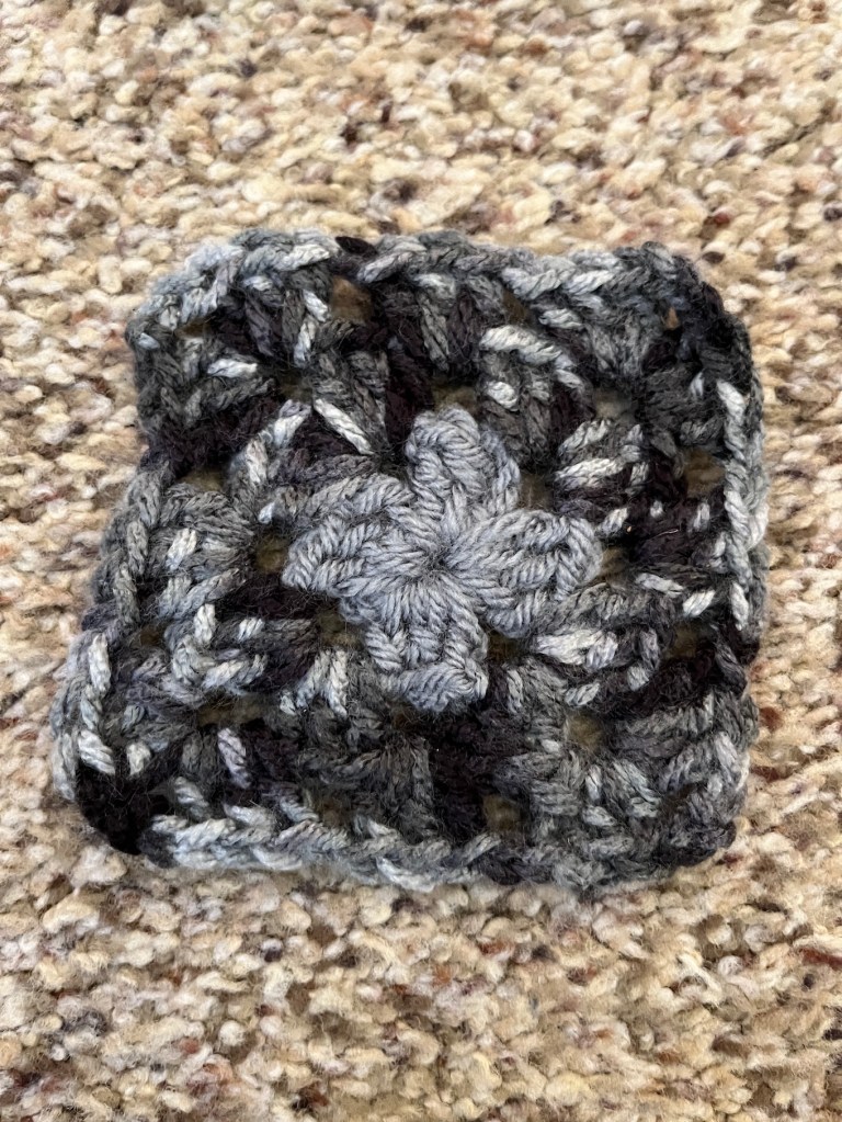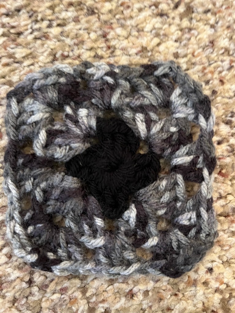 I am using black and gray acrylic yarn I got from the thrift store, including a variegated yarn of grays and black. So far I have 34 done and I think I will eventually make 100 granny squares to someday join into a blanket.