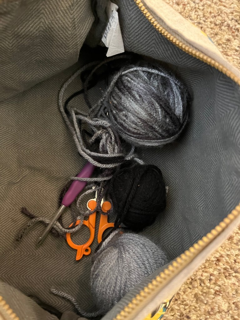 So I started carrying around either a little knitting to work on in the car or a crochet project (usually granny squares) in this bag: