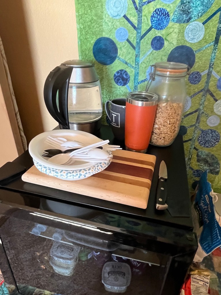 So far so good – I can turn on the electric kettle, make myself a cup of tea and put together some yogurt and granola for breakfast. I also have snacks during the day (healthy and naughty) if I get hungry; and a selections of beverages to quench my thirst. It is sort of like my own apartment upstairs – ha!