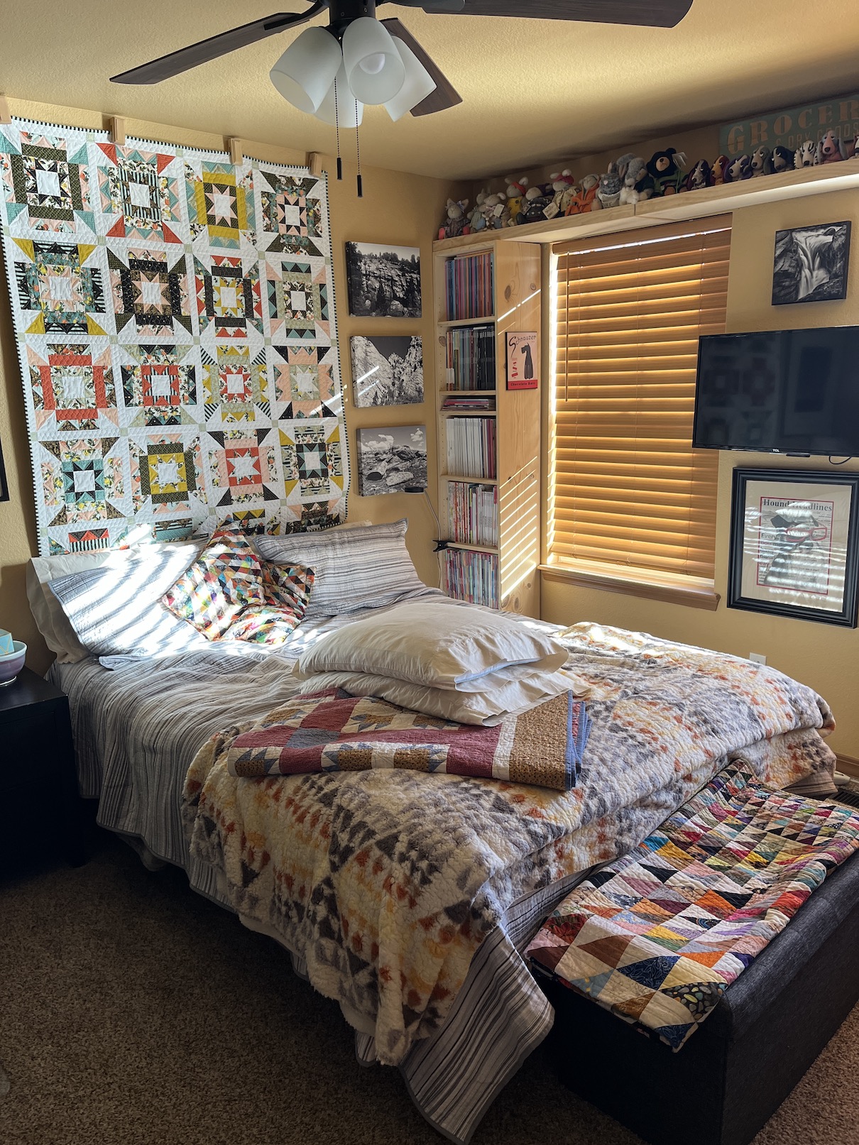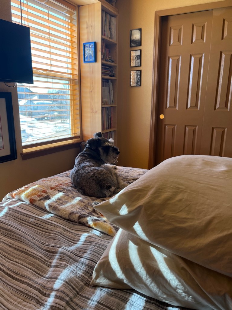It’s cheerful and sunny, has a small TV mounted to the wall; and Mike the Miniature Schnauzer likes to hang out in the corner of the bed where he can catch sun and watch for any suspicious activity in front of the house (like those dastardly UPS, Amazon Prime, and FedEx drivers who like to ring the doorbell and run off!).
