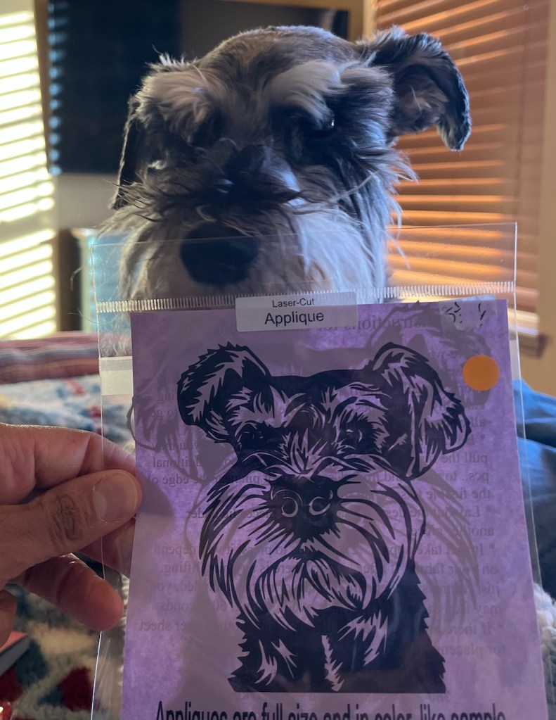 Here is Mike with the cool laser cut iron on appliqué schnauzer included in one of the gift packages:
