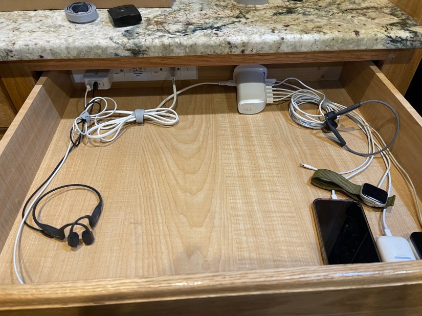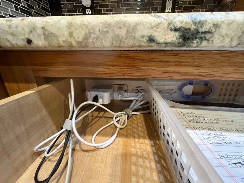 John did some wiring to set up an outlet in the back of the kitchen cabinet, cut a hole in the former “junk drawer” and created a charging station: