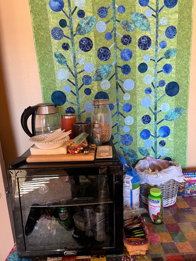 John built a stand for it and now I have a drink and tea area in my quilting studio: