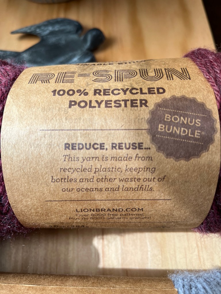 I didn’t have anything in mind that I needed but I took a leisurely stroll (as leisurely as one can stroll on a knee scooter) through the yarn section. There I discovered a collection of skeins of yarn made from RECYCLED PLASTIC!