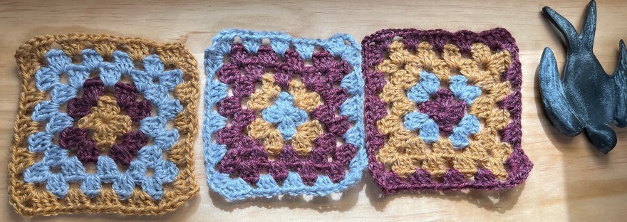I made a couple sample blocks for a future granny square blanket with the yarn: