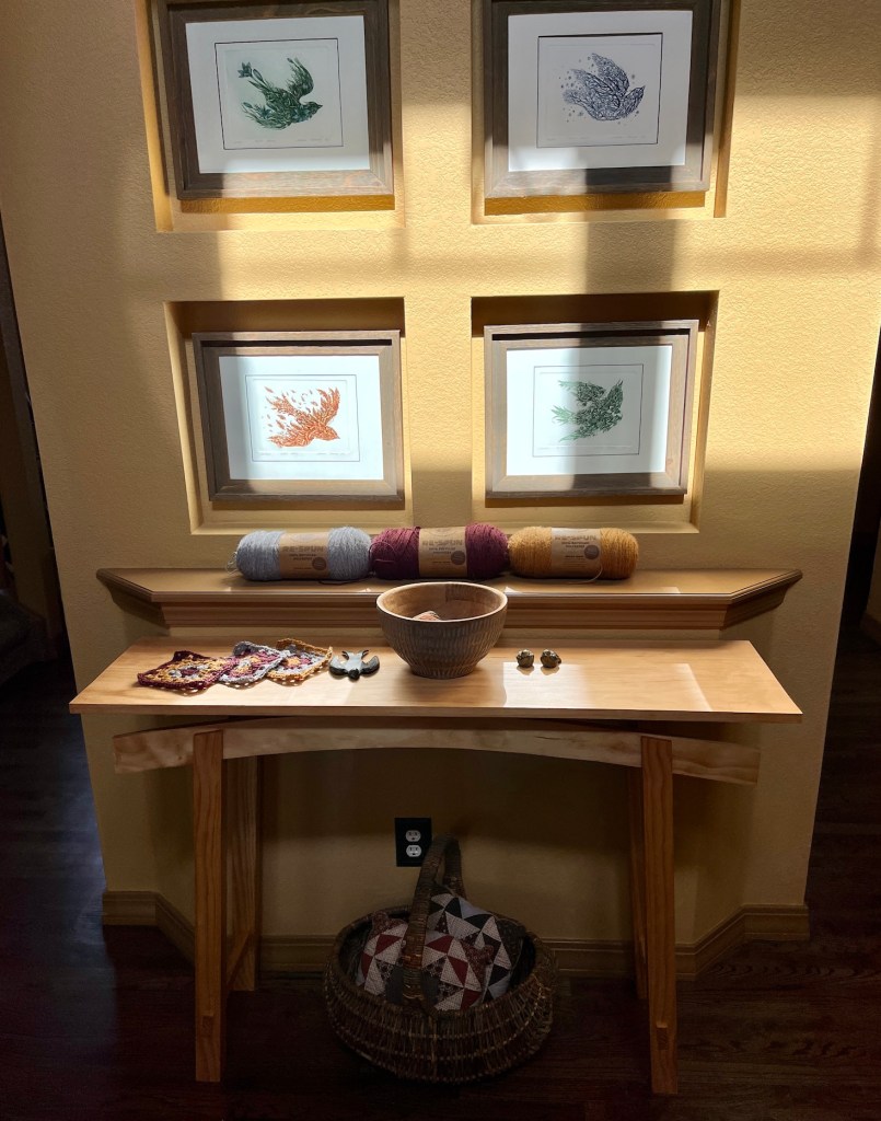 I didn’t have the best light when I was photographing and I am limited where I can do a photoshoot in my knee scooter (recovering from broken ankle and subsequent surgery if you are just joining us). I took photos on the table John made (see post From the Woodshop: Floating Top Hall Table) in the entryway.