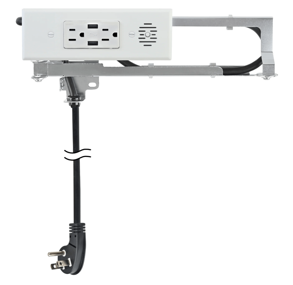 John found on the web, a special “drawer charging system” which allows you to turn a drawer into a “charging station” by adding an outlet to the drawer. This special system has a swinging arm that holds the cord from the plug which mounts inside the drawer, so that you can easily open and close the drawer.