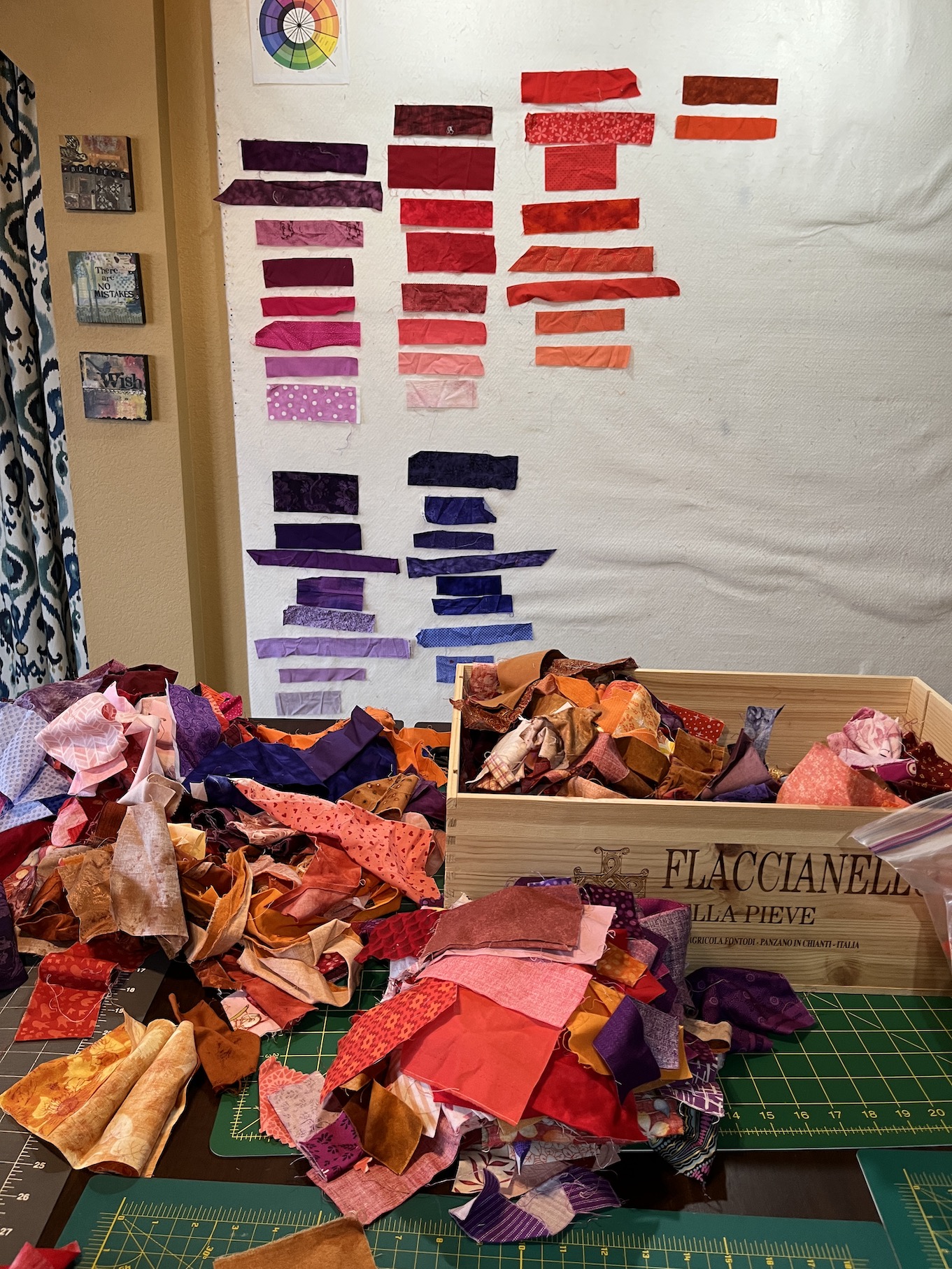 Currently I am sorting through my box of Reds, Purples, and Oranges to begin the project (I’ve organized many of my fabric scraps into wine crates that liquor stores have my kind enough to gift me or sell to me cheaply).