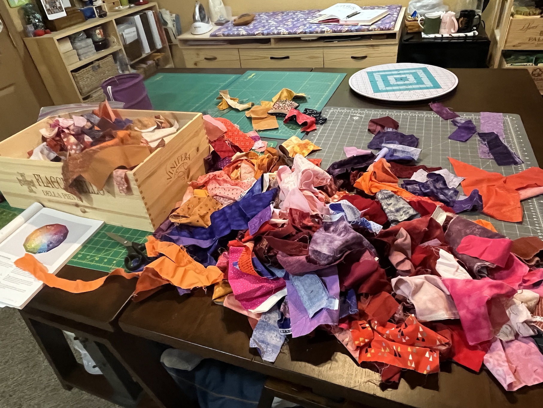 I have a lot of sorting to do to find the strips from my large collection of fabric scraps for the piece.
