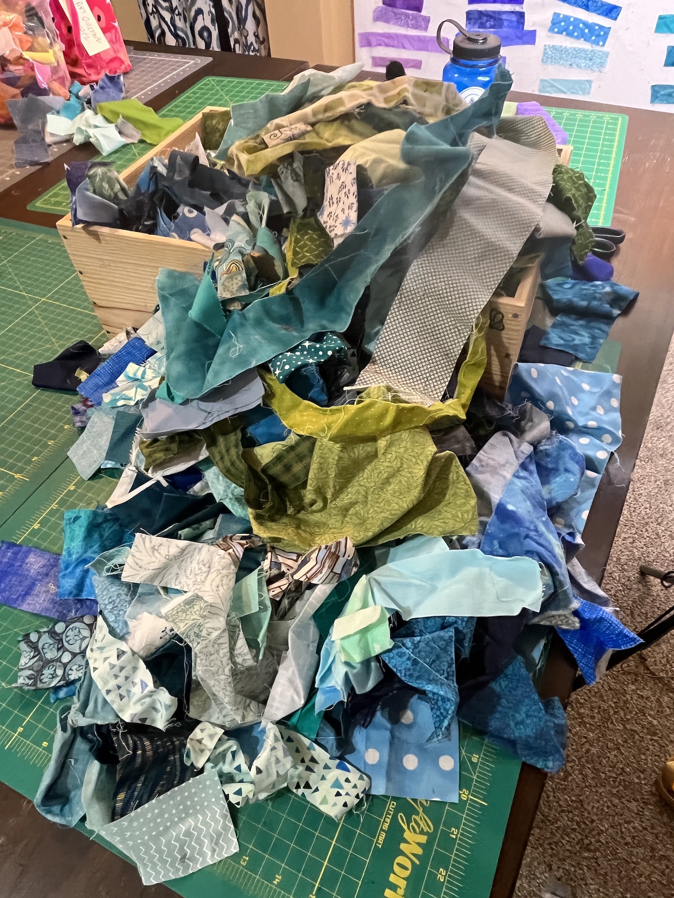 By the time I got to greens and blues, which I saved until the end, I was coughing from fabric scrap dust!